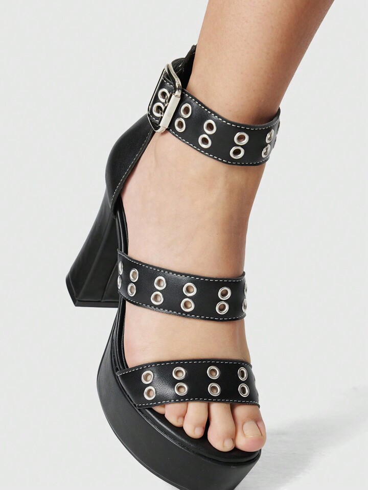 Grunge Punk Women's Metal Punk Cross Pendant Chain Block Heel Platform High Heel Sandals, Casual Rock Punk Campus Wear Spring Shoes Spring Break Easter Prom Heels
