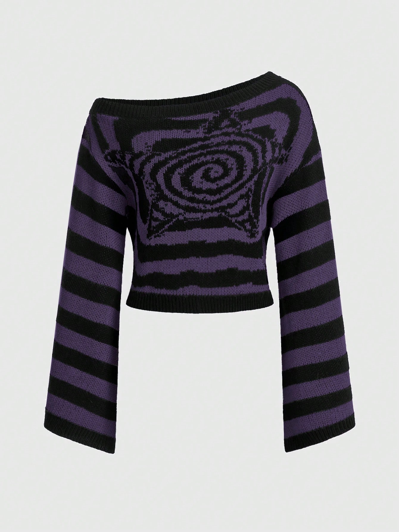 Grunge Punk Women's Pentagram Striped Pattern Asymmetric-Shoulder Long Sleeve Fashionable Sweater