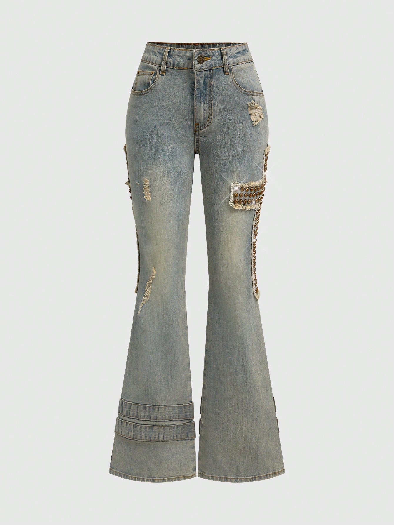 Grunge Punk Women's Pocket Distressed Cross Rivet Patch Design Casual Versatile Vacation Travel Flare Jeans