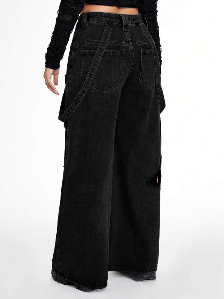 Grunge Punk Women's Punk Distressed Washed Star Patch Loose Fit Wide Leg Black Denim Jeans