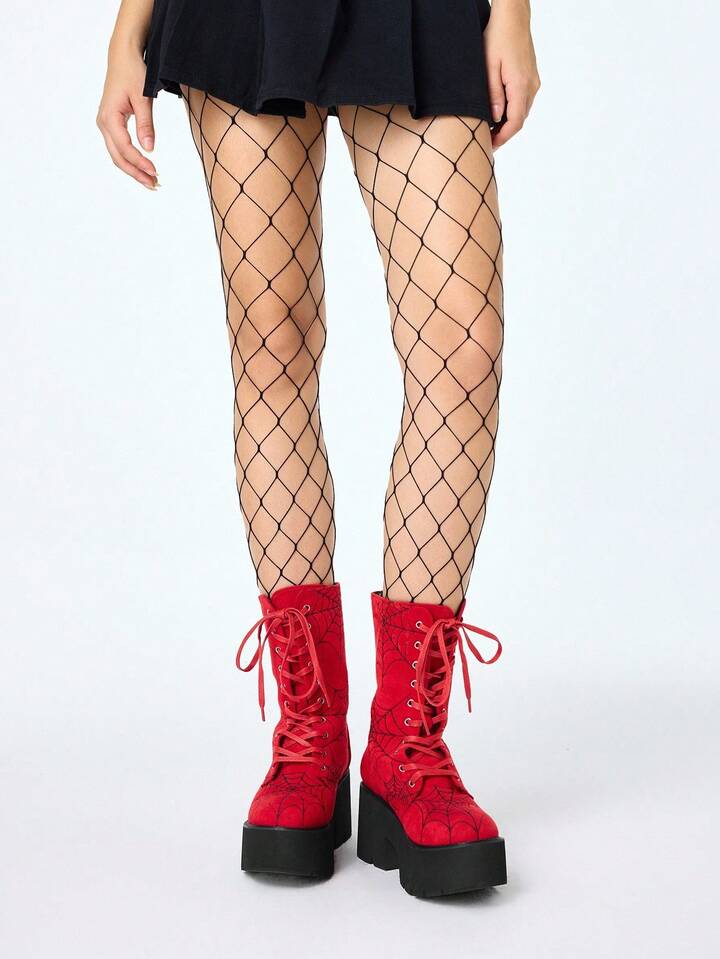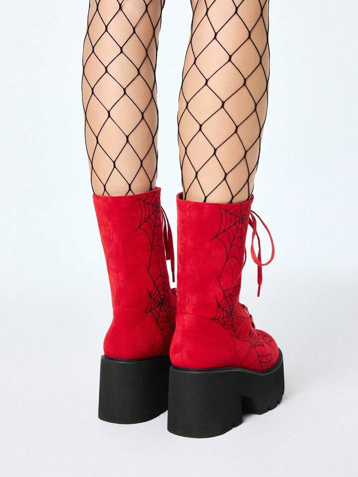 Grunge Punk Women's Punk Style Thick Sole Lace-Up Mid-Calf Boots, Gothic Y2K Spider Web Embroidery Decor Platform Lace-Up Tall Boots, Comfortable Party Motorcycle Combat Boots, Halloween