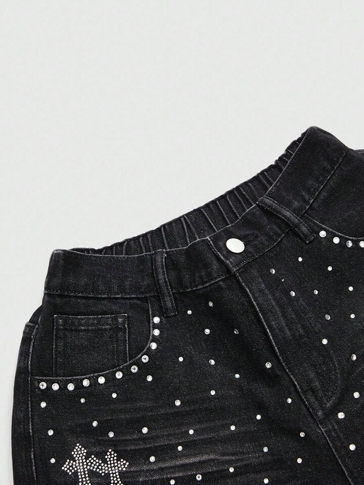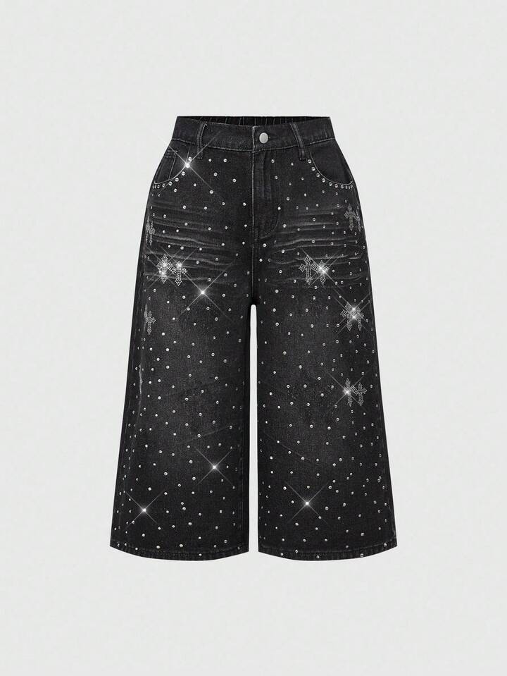 Grunge Punk Women's Rhinestone Cross Pocket Wide Leg Loose Denim Capri Pants