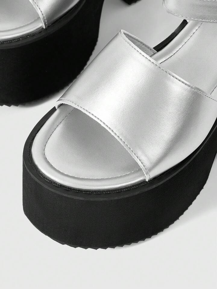 Grunge Punk Women's Silver Thick Bottom Chunky Heel Strap Slide Open Toe Sandals, Minimalist Casual Summer Shoes, Fashion Ankle Strap Platform High Heels