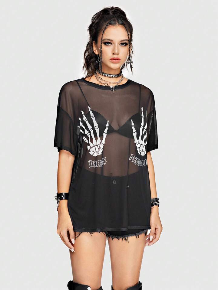 Grunge Punk Women's Skeleton Hand See-through Mesh Top