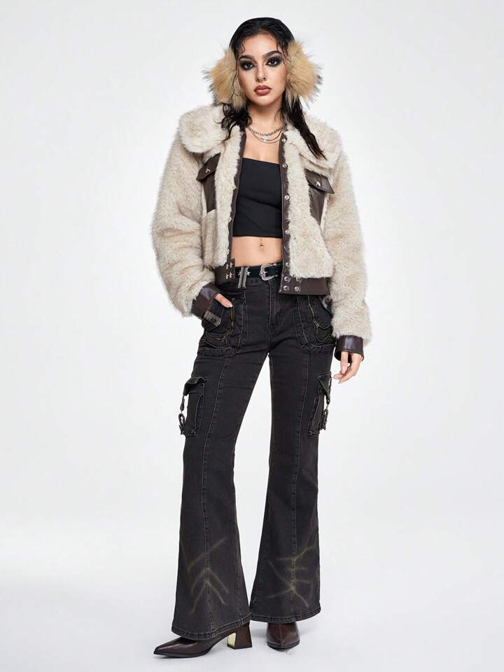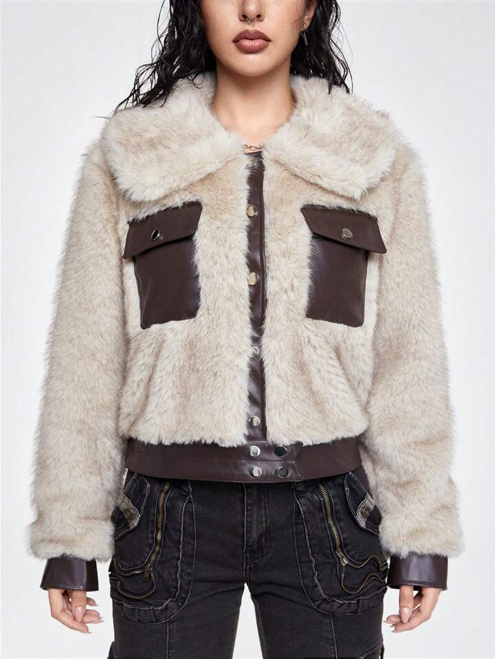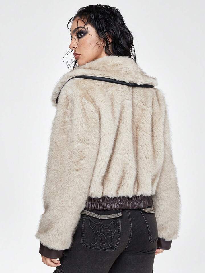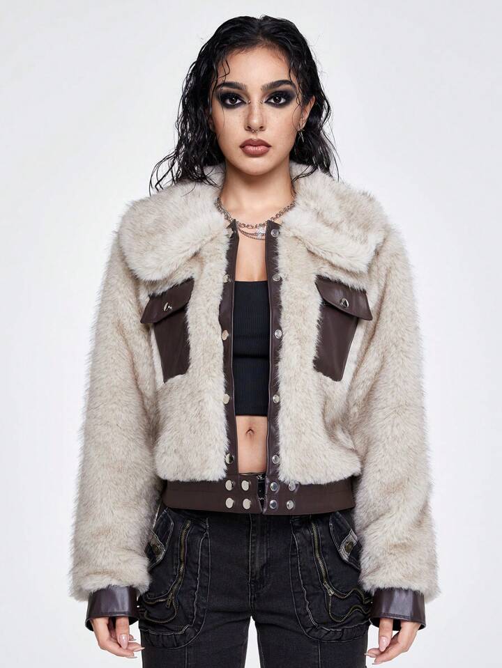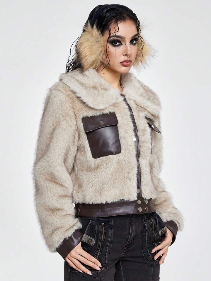 Grunge Punk Women's Snow Outfit Faux Fur Trimmed PU Pocket Jacket