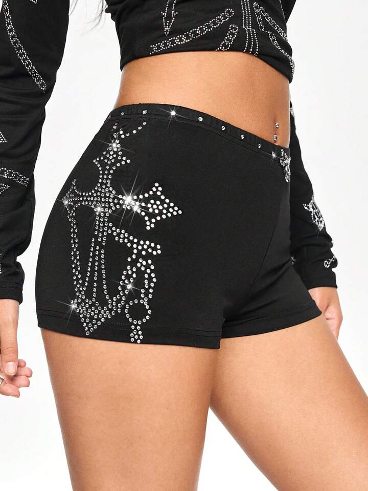 Grunge Punk Women's Ultra Low Waist Skinny Rhinestone Cross Pattern Mini Shorts
