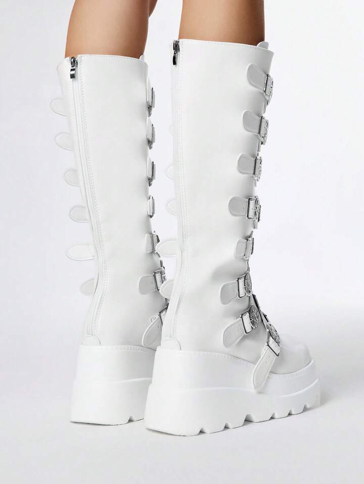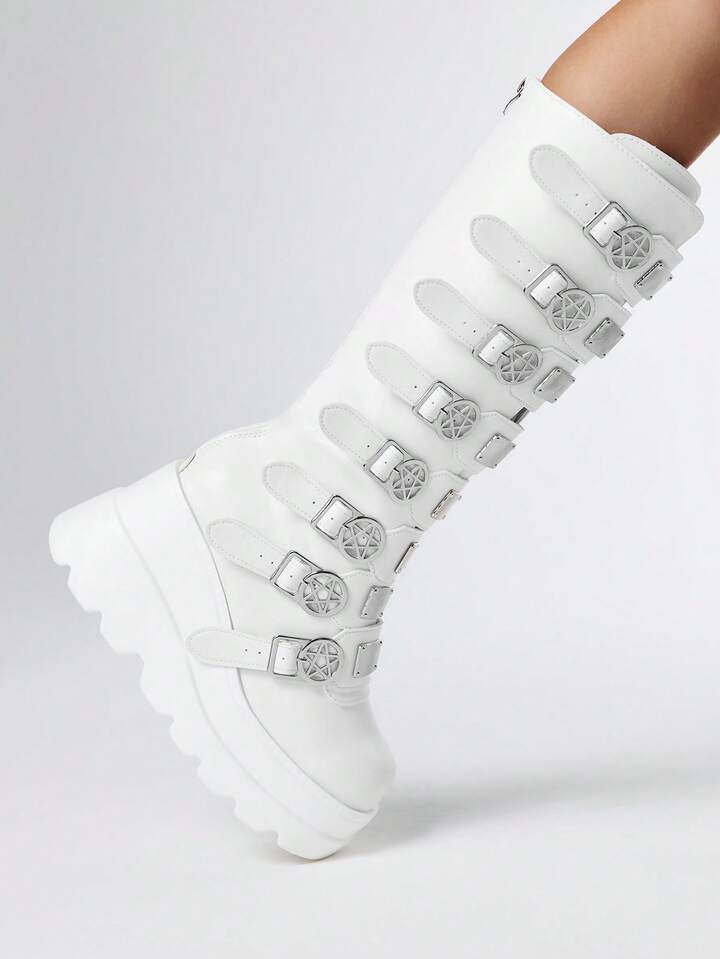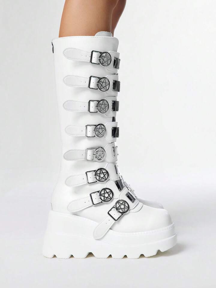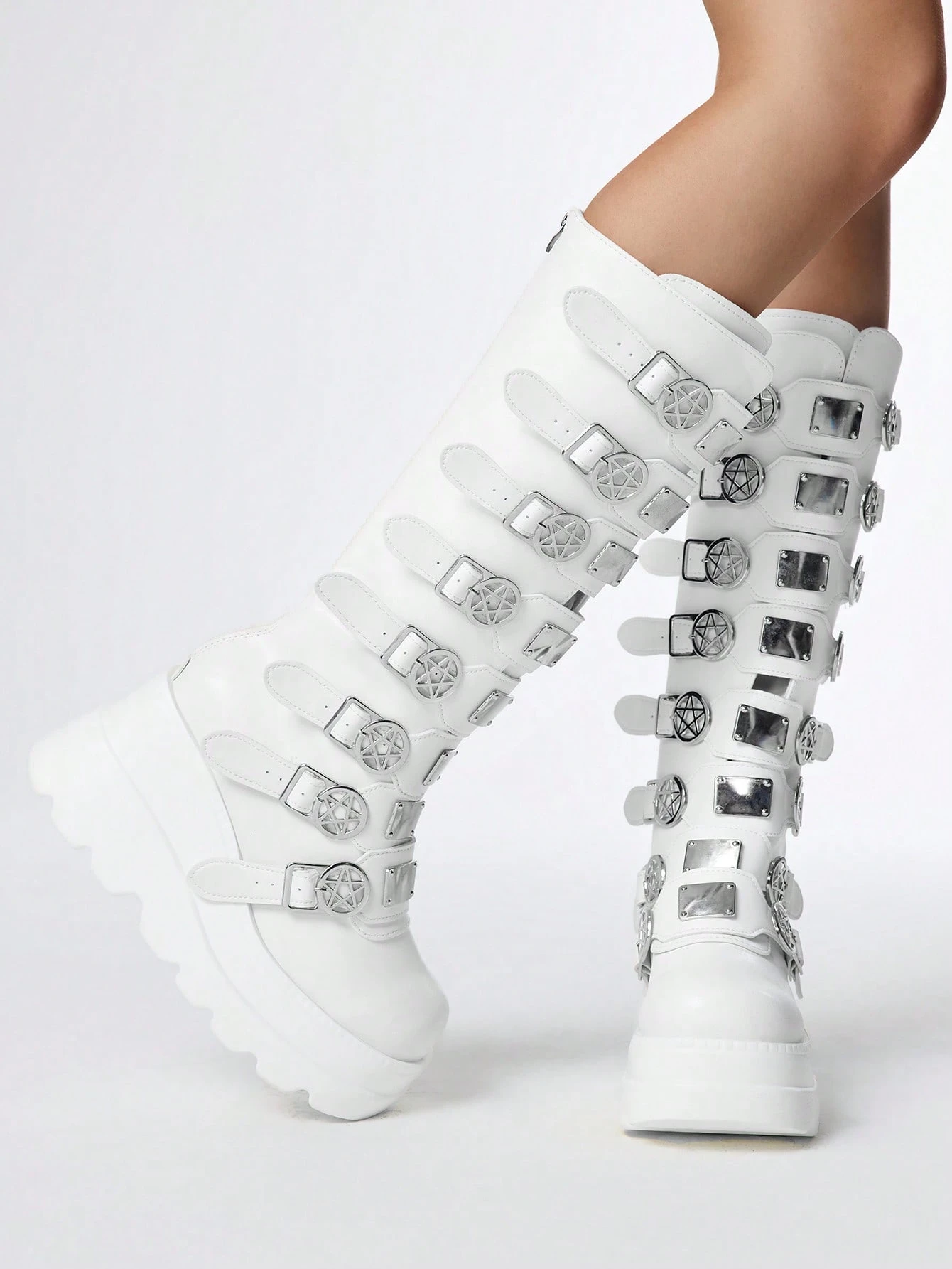 Grunge Punk Women's White Round Toe Platform Goth Punk Lace-Up Knee-High Boots With Rivet Five-Pointed Star Buckle