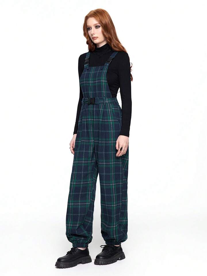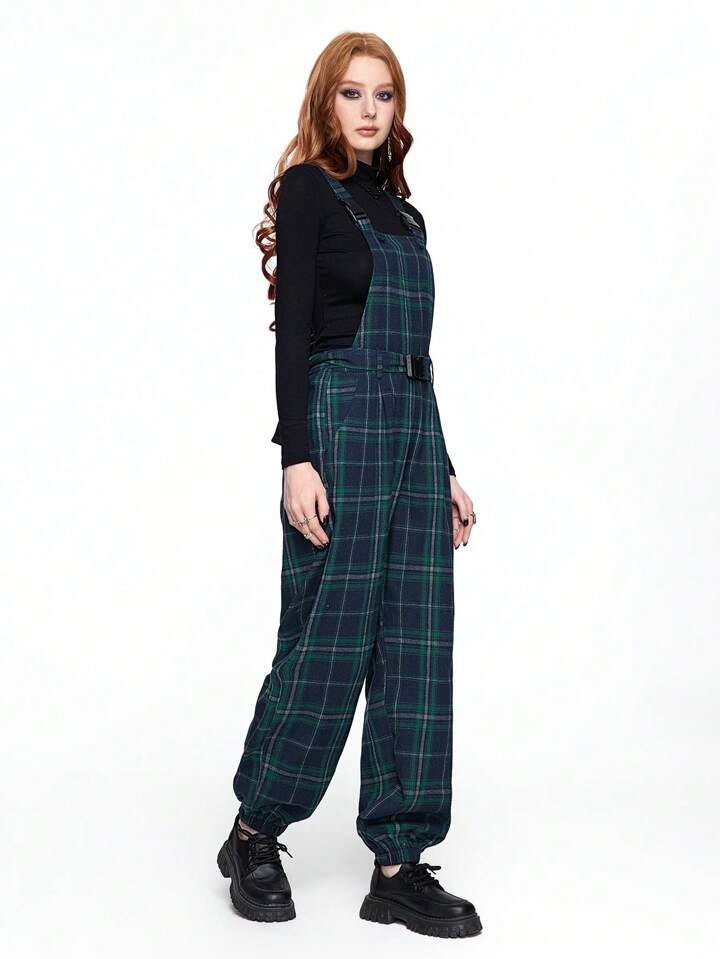 Grunge Punk Women's Wide Strap Plaid Jumpsuit, Casual Daily Wear