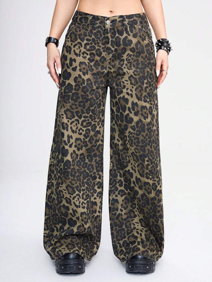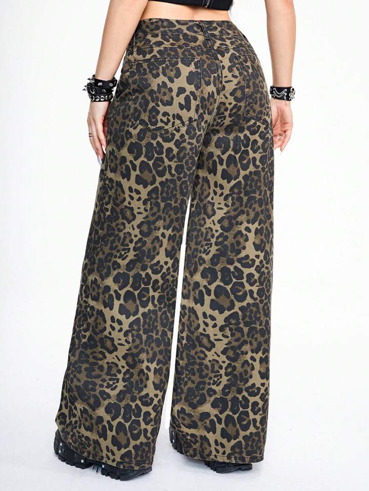 Grunge Punk Y2K Casual Leopard Print Full-Length Wide-Leg Denim Jeans For Women, School
