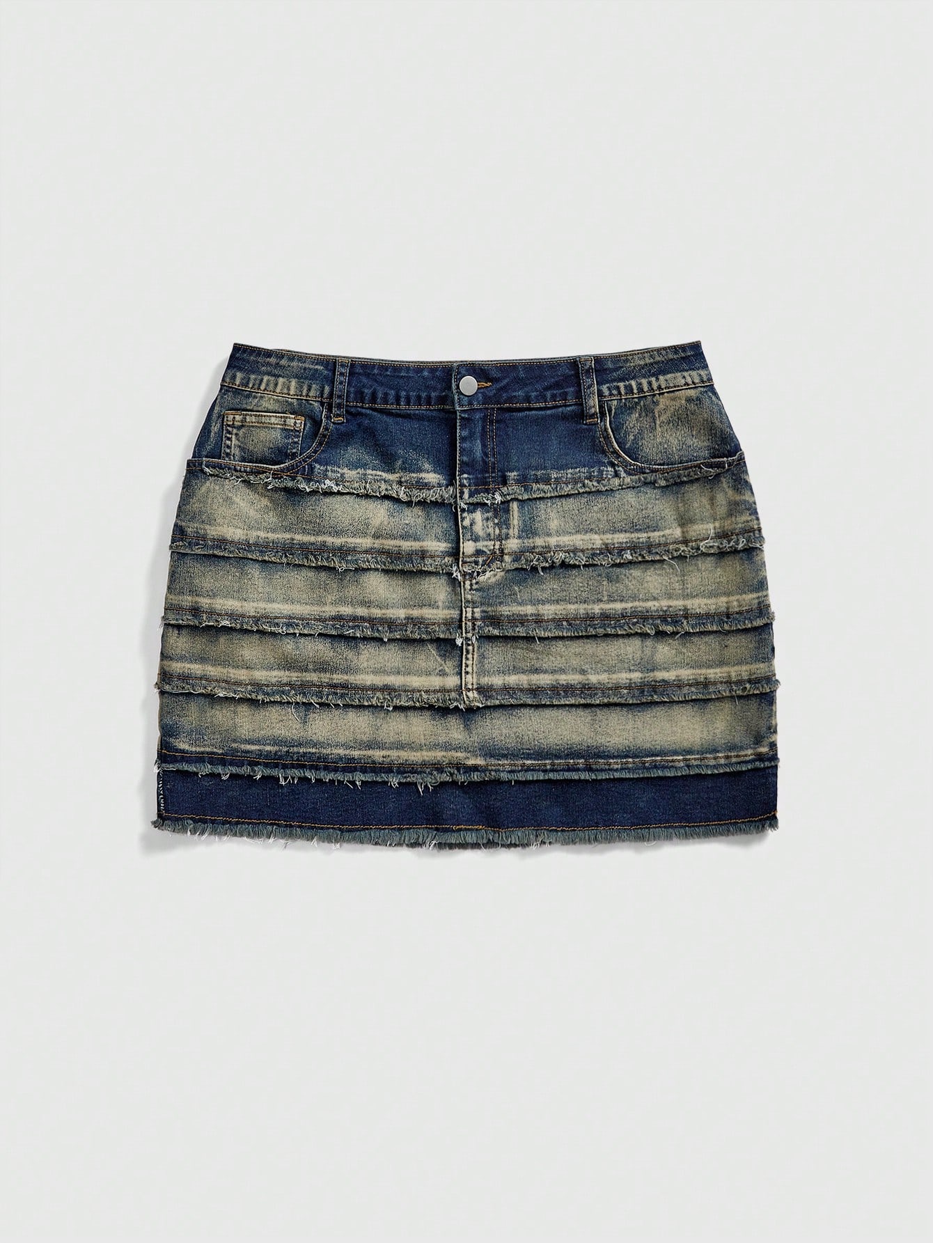 Grunge Punk Y2K Faded Distressed Multi-Layer Frayed Patchwork Plus Size Denim Mini Skirt, Subculture Vintage Washed Denim Skirt