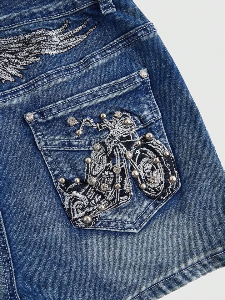 Grunge Punk Y2K Lady Low-Rise Denim Mini Shorts With Wing Embroidery, Pocket, Motorcycle Patches, Rhinestones And Studs Decoration, School