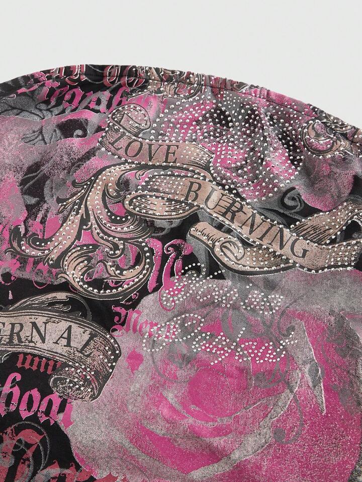 Grunge Punk Y2K Music Festival, Vintage Romantic Rose Floral Print Vine Heart Rhinestone Decor Slim Fit Bandeau Top For Women