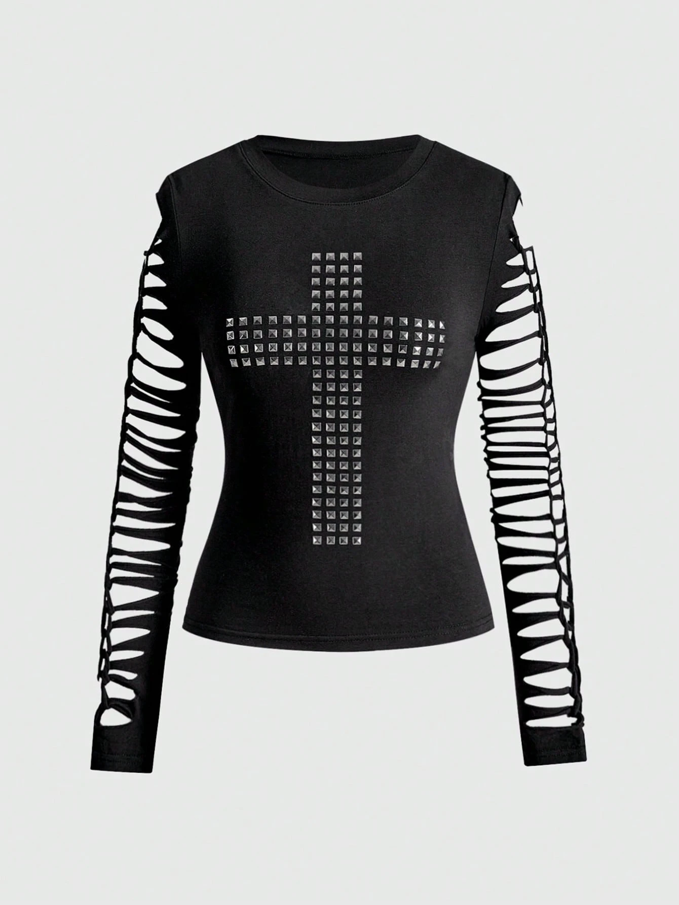 Grunge Punk Y2K Punk Kpop Cross Rivet Design Sleeve Burnout Hollow Out Fitted Long Sleeve T-Shirt, Solid Color Versatile