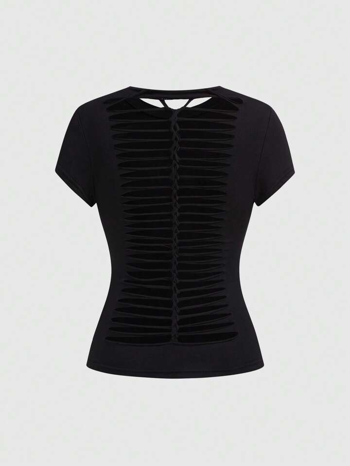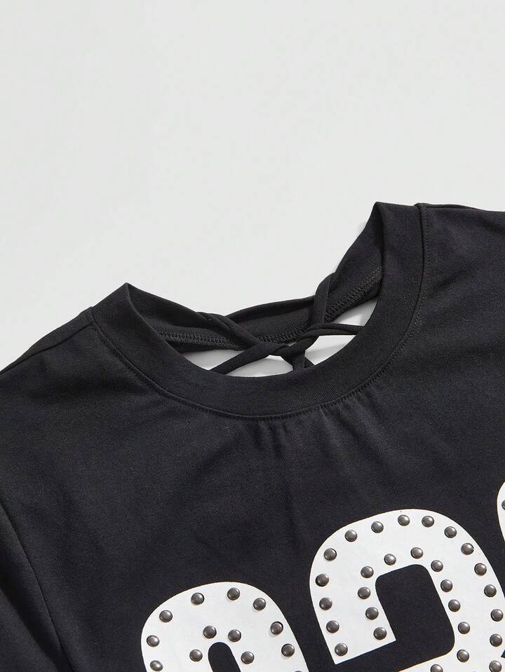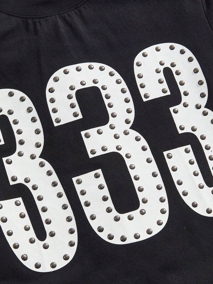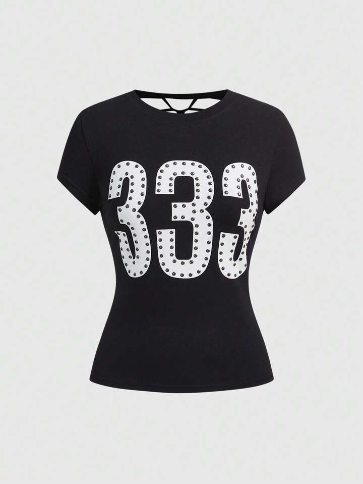 Grunge Punk Y2K Punk Numeric Print Sequin Design Fitted T-Shirt, Solid Color Versatile Women's T-Shirt
