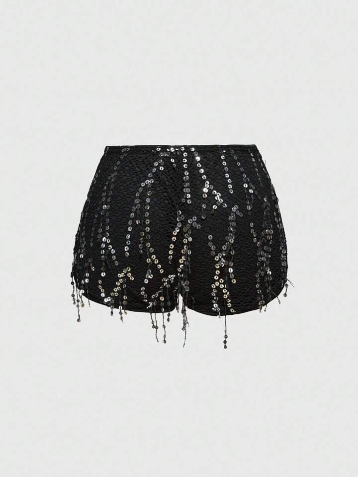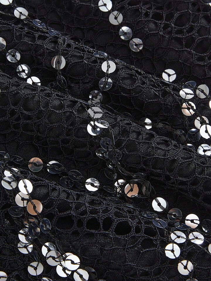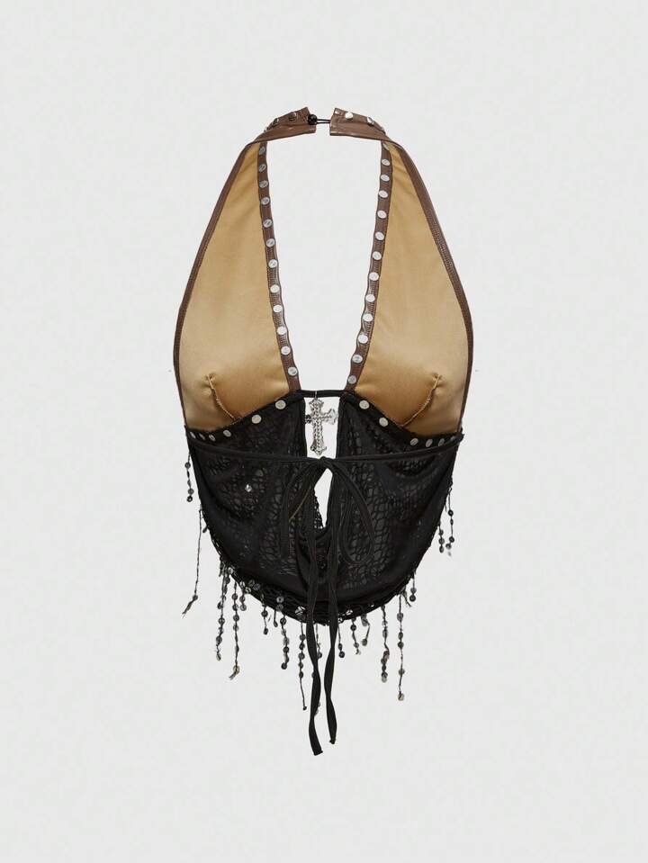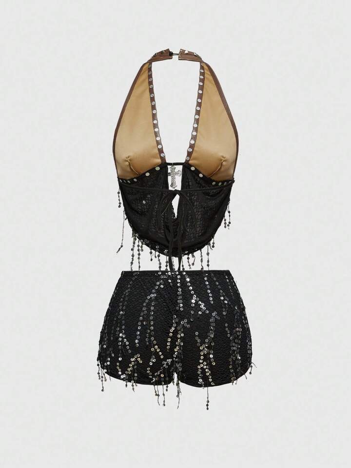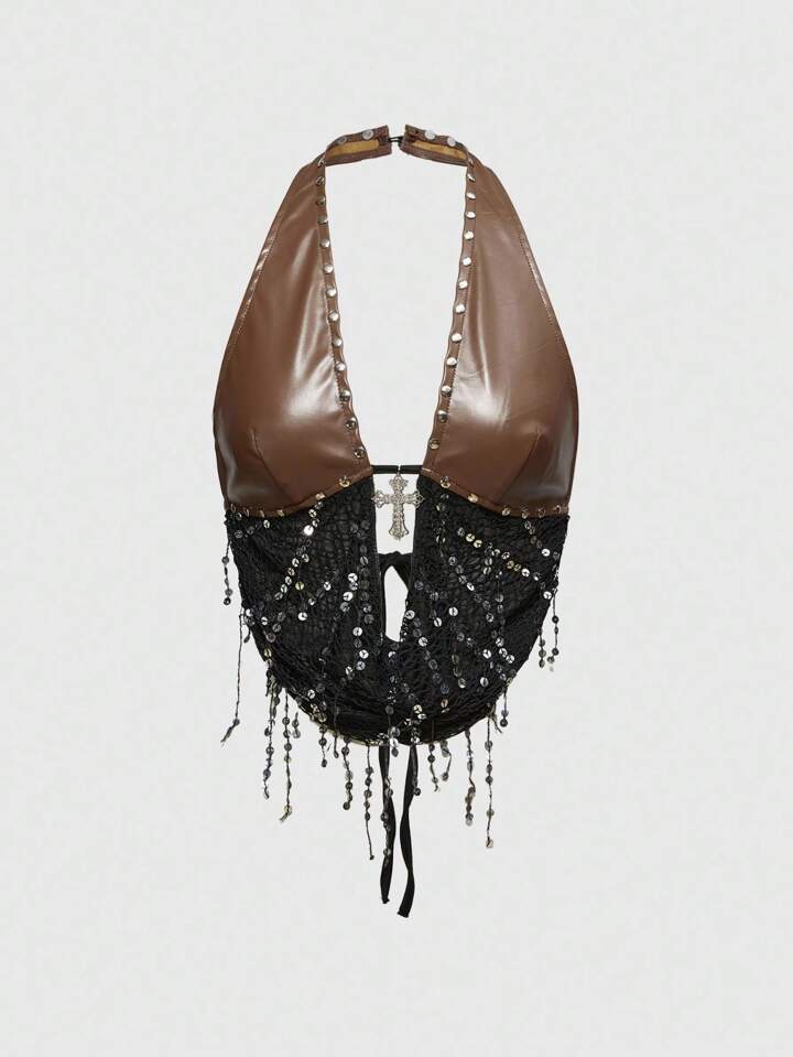 Grunge Punk Y2K Sexy Music Festival Outfit, Metal Cross Pendant, PU Patchwork Fishnet Sequins, Draped Neck Backless Necklace, Women Sets