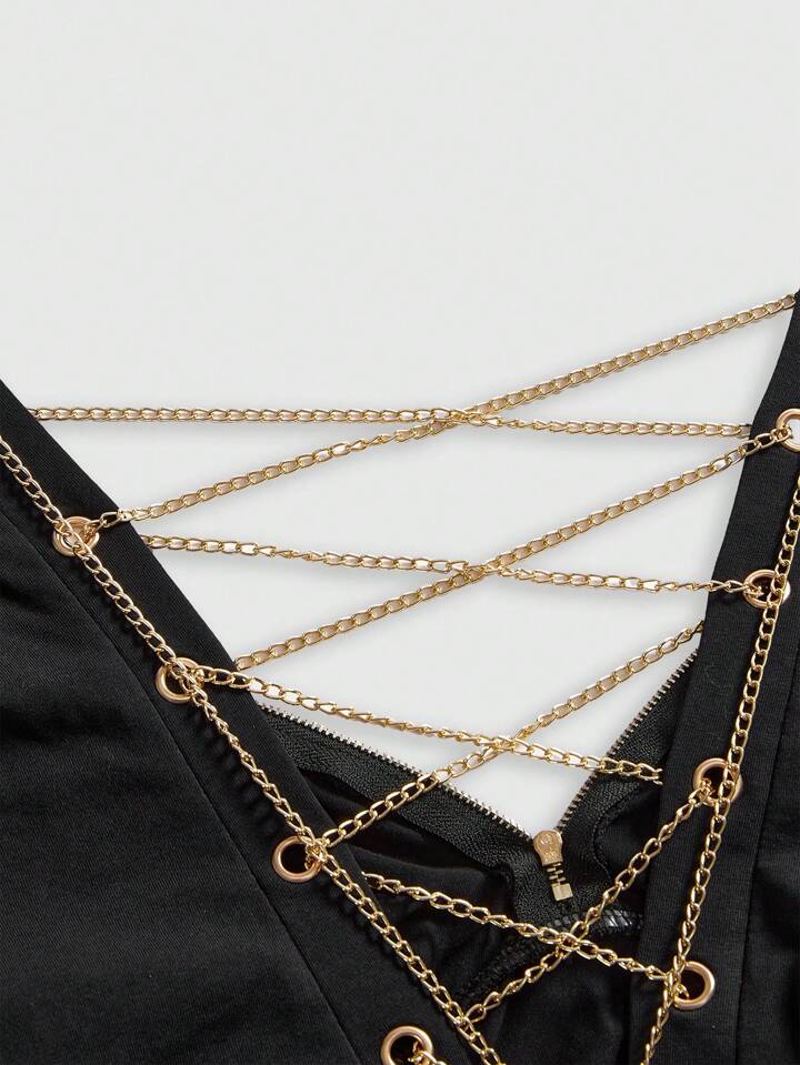 Grunge Punk Y2K Style Crop Top For Women, Retro Black And Gold Colorblock Chain Decor Backless Pleated Fitted All-Match T-Shirt