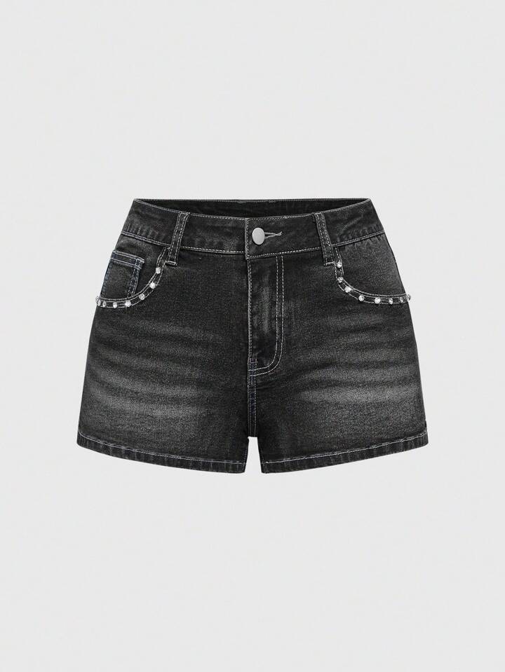 Grunge Punk Y2K Style Cross Embroidered & Rhinestone Decor Extremely Low Rise Mini Denim Shorts For Women