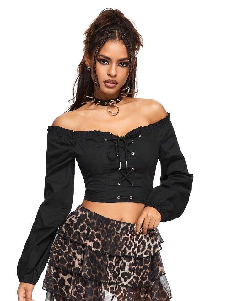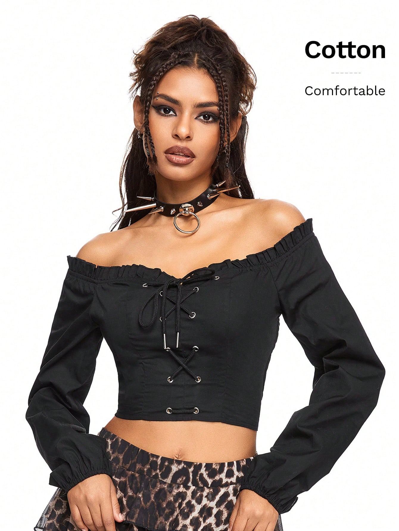 Grunge Punk Y2K Style Plain Tie-Up Decor Off Shoulder Crop Long Sleeve Shirt