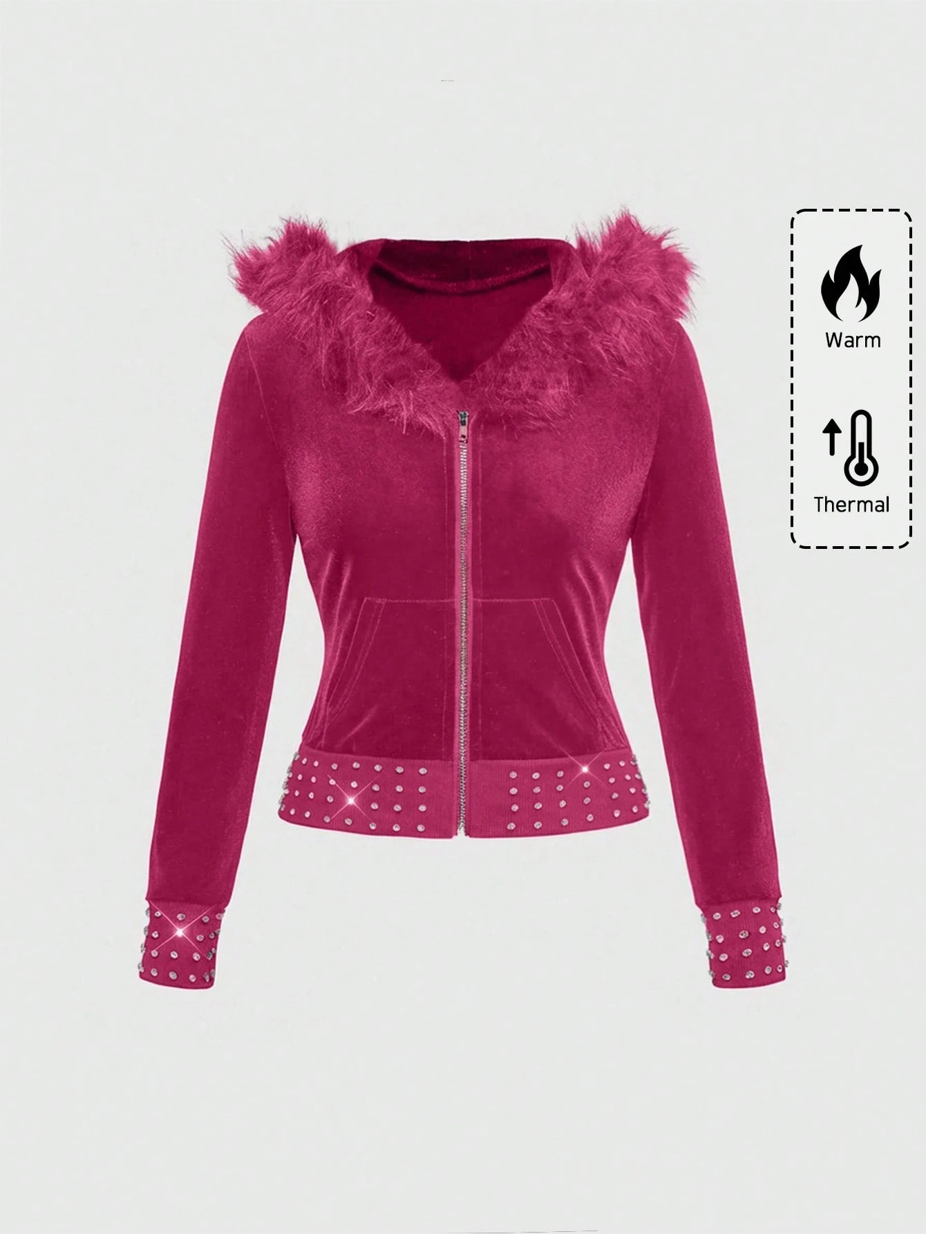 Grunge Punk Y2K Style Velvet Zip-Up Sweatshirt With Rhinestone Decor, Fitted For Women