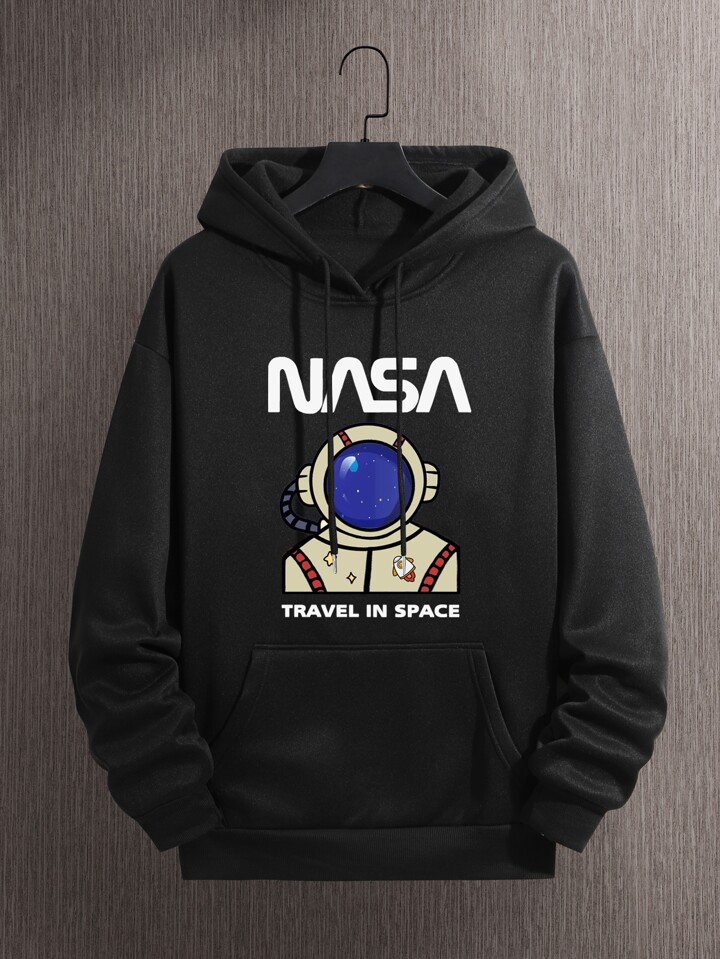 Guys Astronaut & Letter Graphic Kangaroo Pocket Drawstring Hoodie