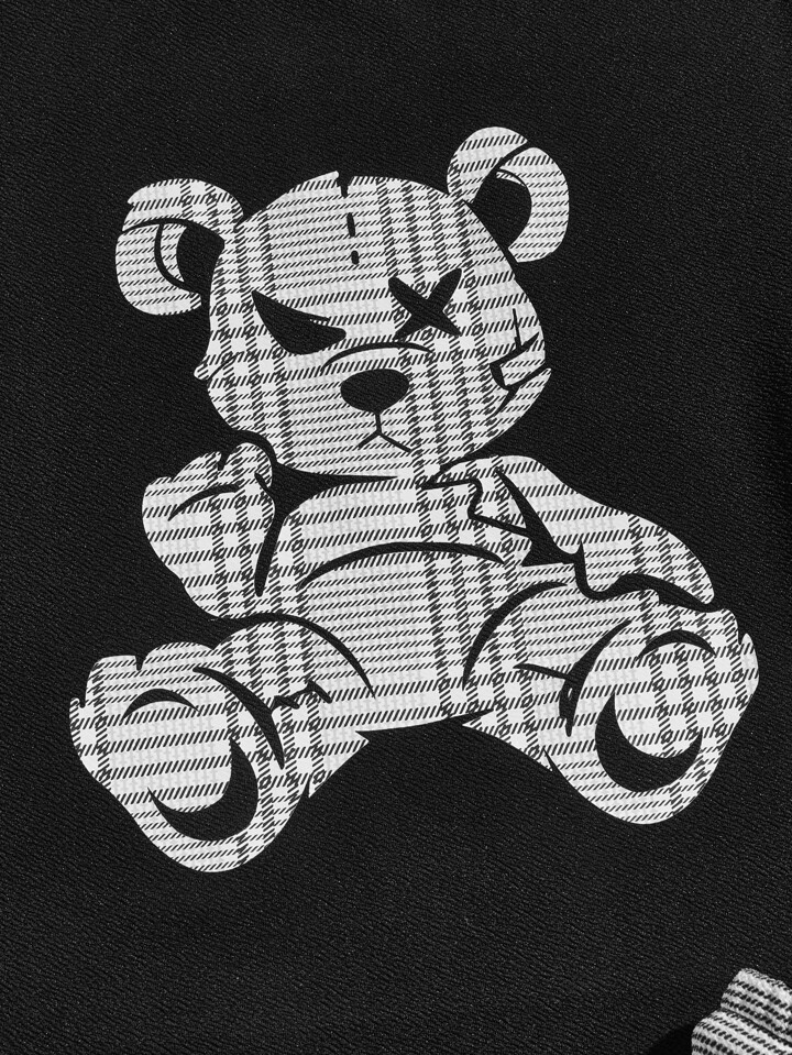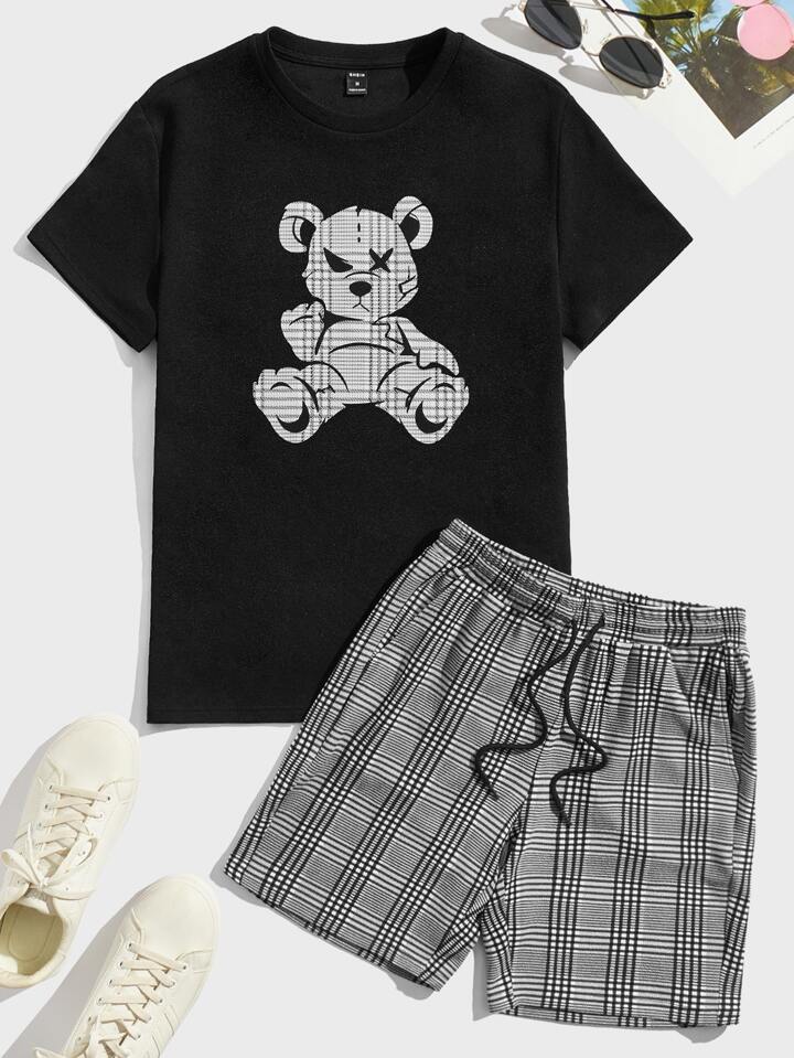 Guys Bear Print Tee & Plaid Drawstring Waist Shorts