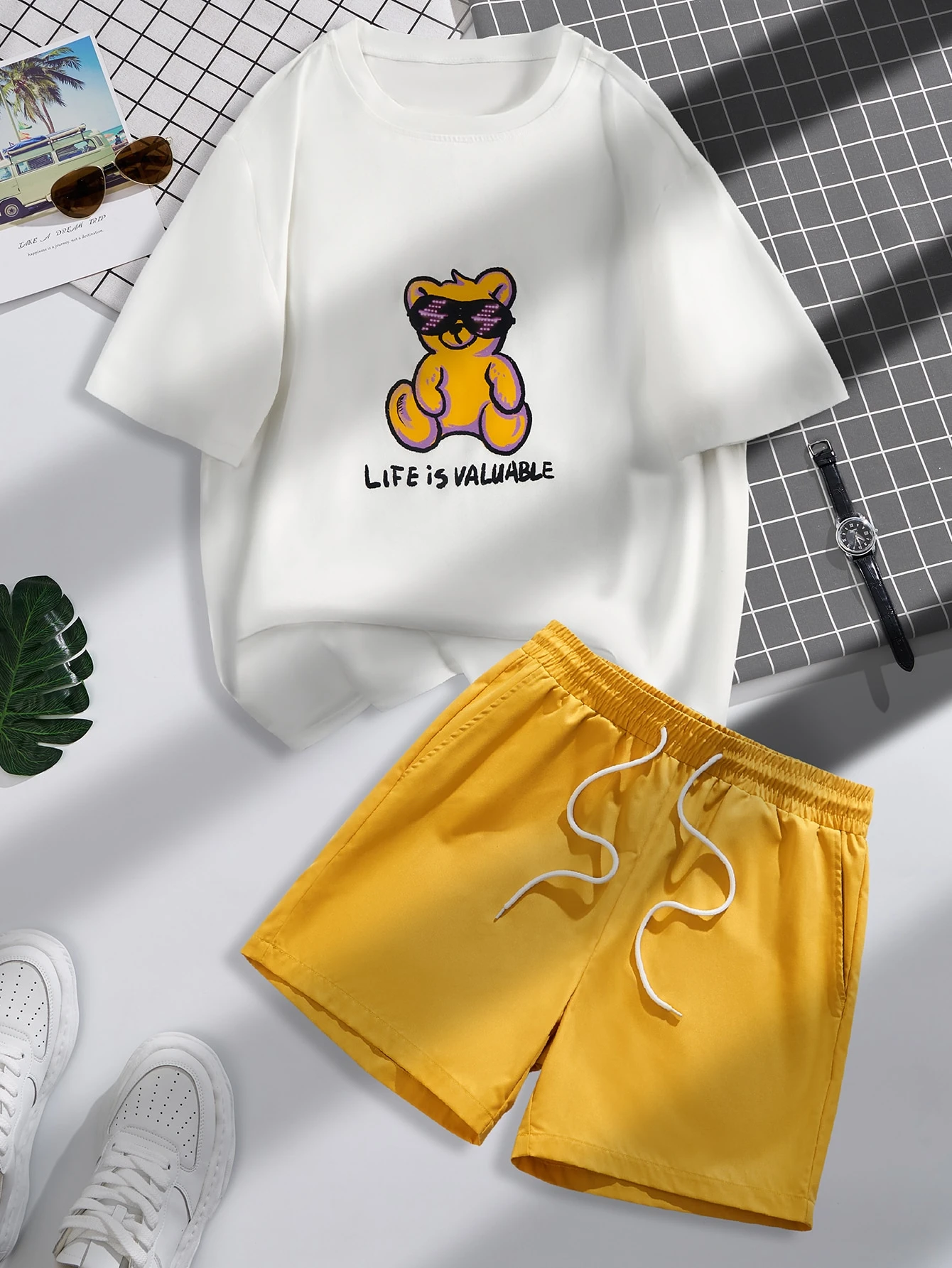 Guys Bear & Slogan Graphic Tee & Drawstring Waist Shorts