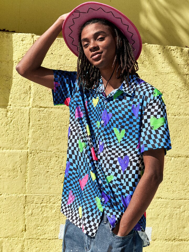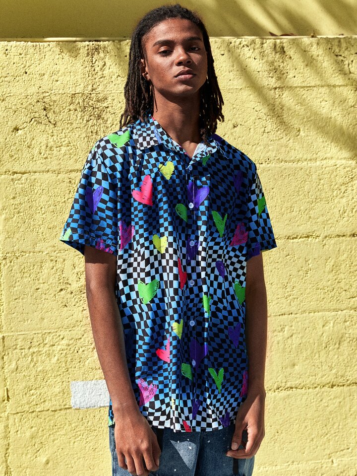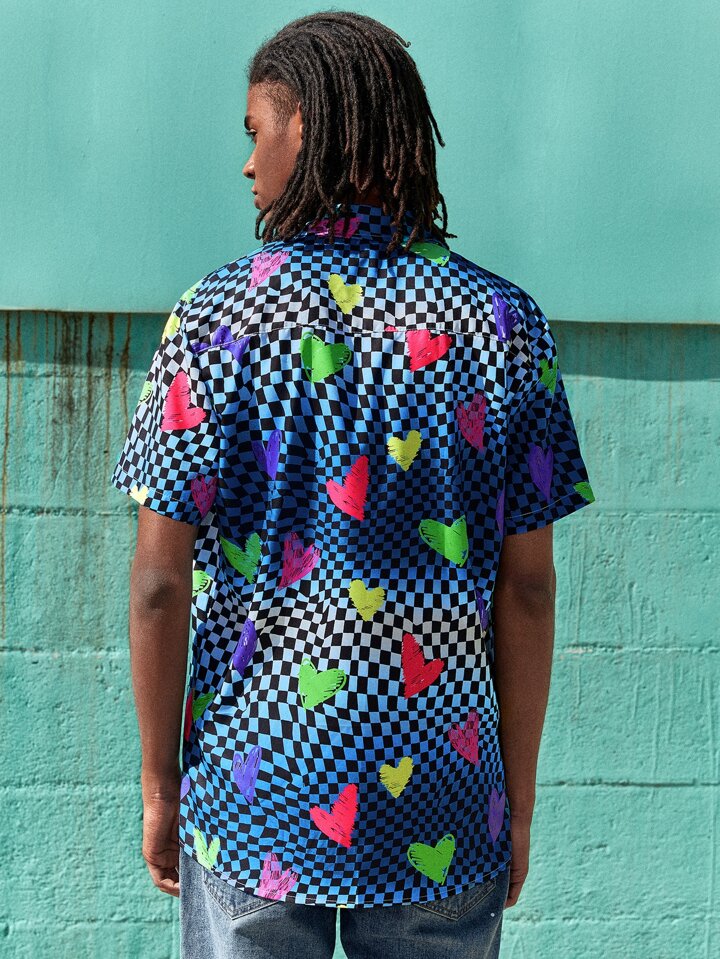 Guys Checkerboard And Heart Print Shirt