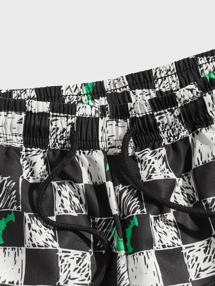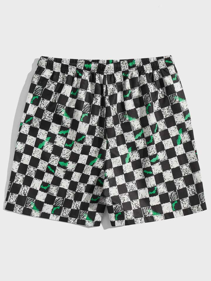 Guys Checkerboard & Bats Print Drawstring Waist Shorts