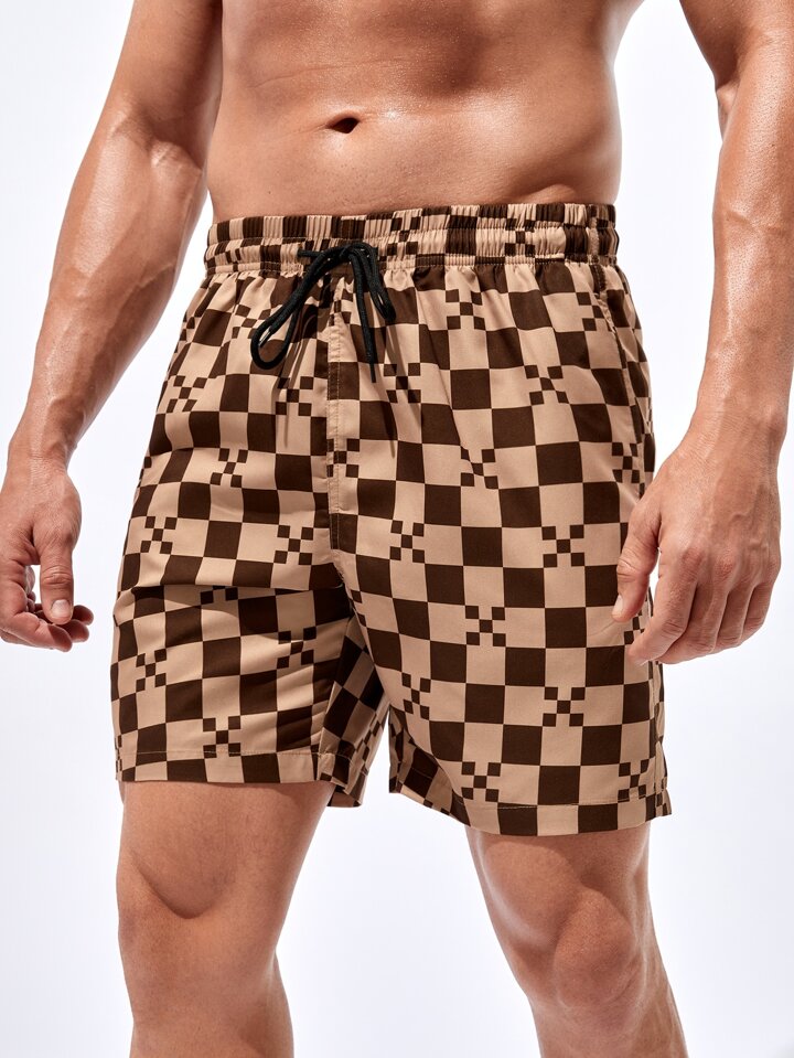 Guys Checkerboard Print Drawstring Waist Swim Trunks