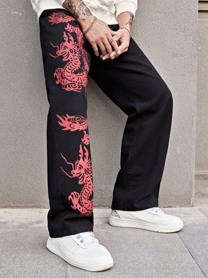 Guys Chinese Dragon Print Jeans
