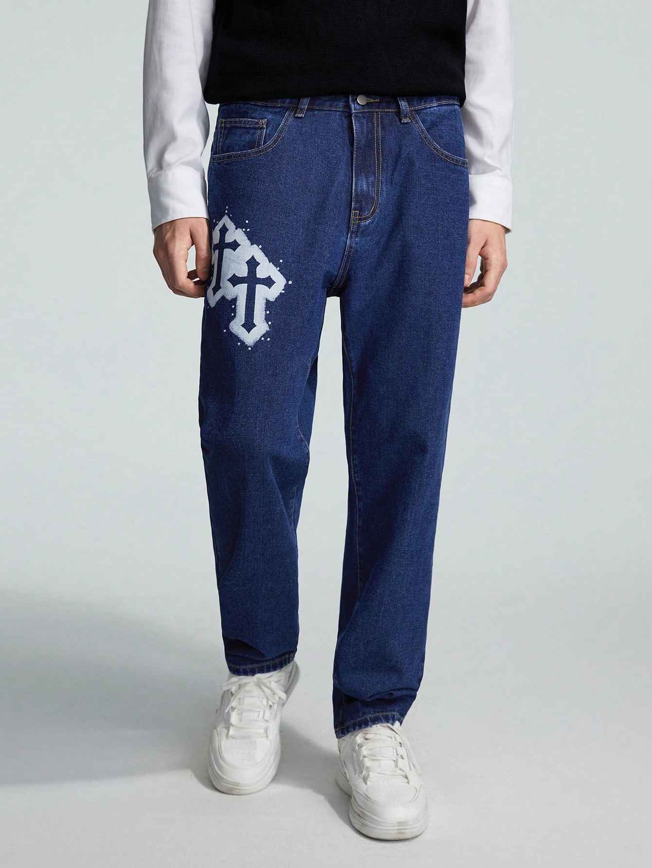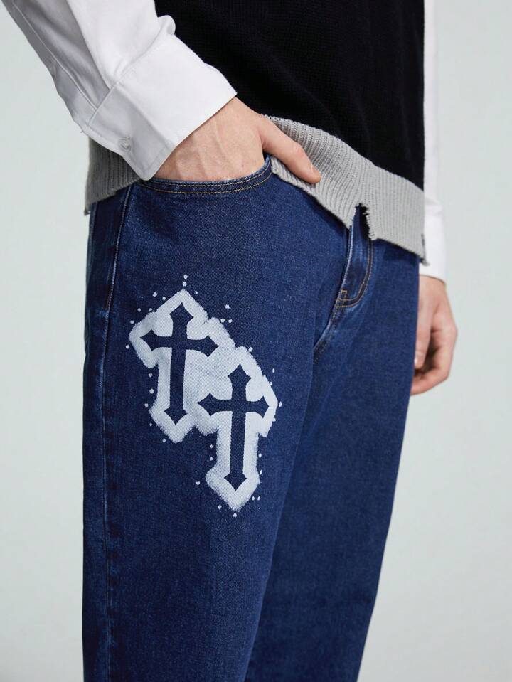 Guys Cross Graphic Straight Leg Baggy Jeans