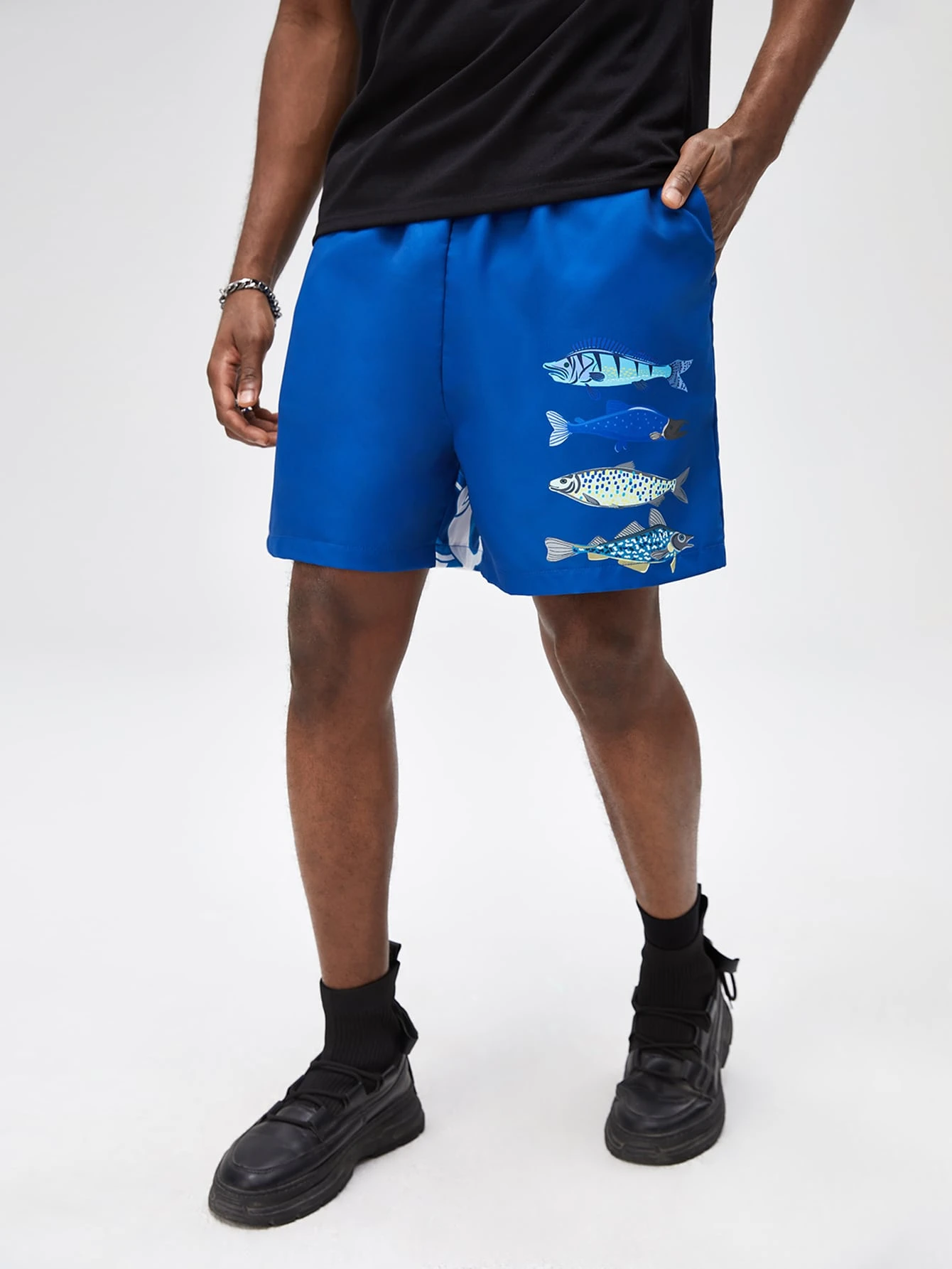Guys Fish & Wave Print Drawstring Waist Shorts