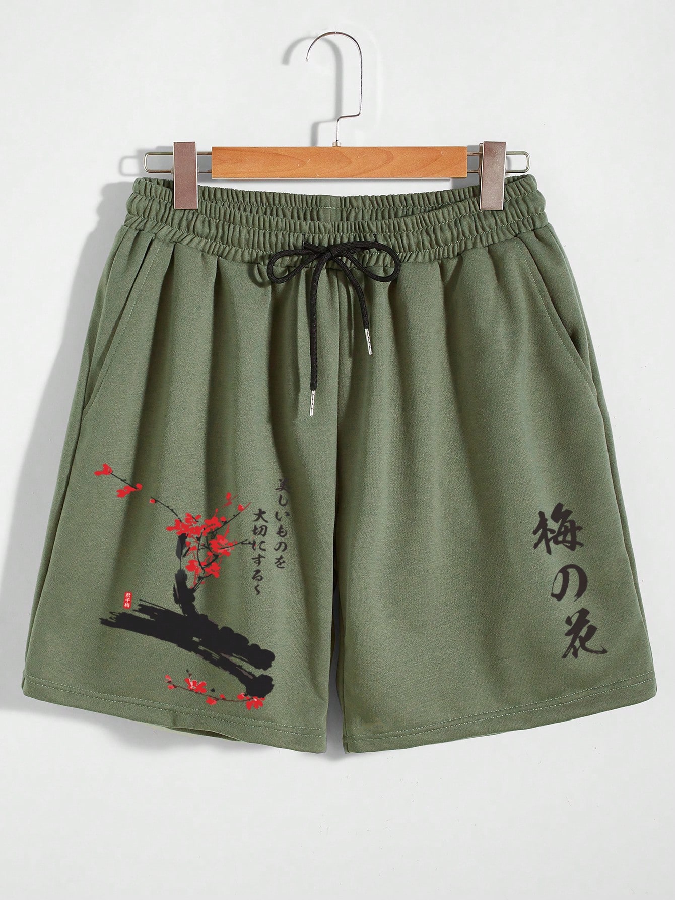 Guys Japanese Letter & Floral Print Drawstring Waist Shorts