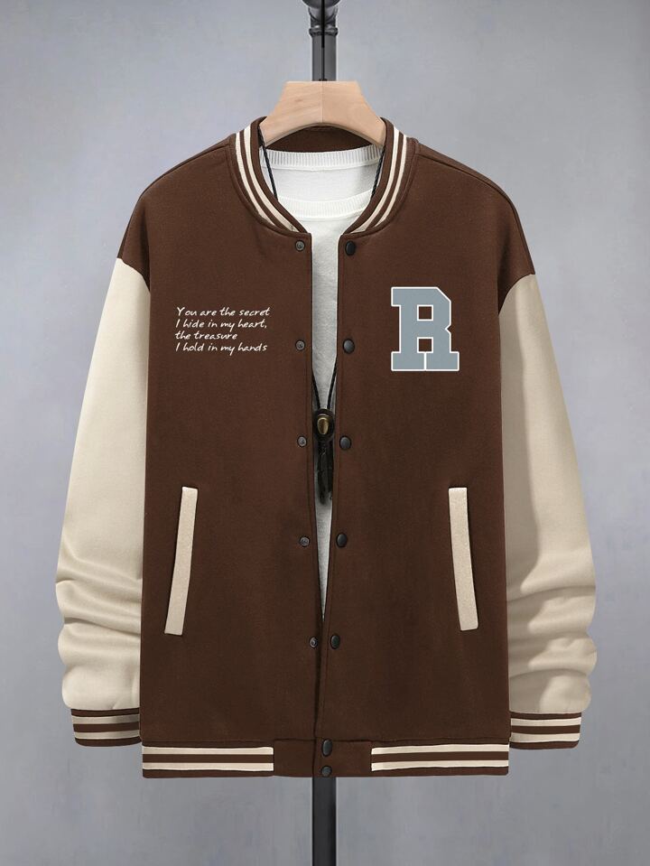 Guys Letter & Skull Print Color-block Thermal Varsity Jacket