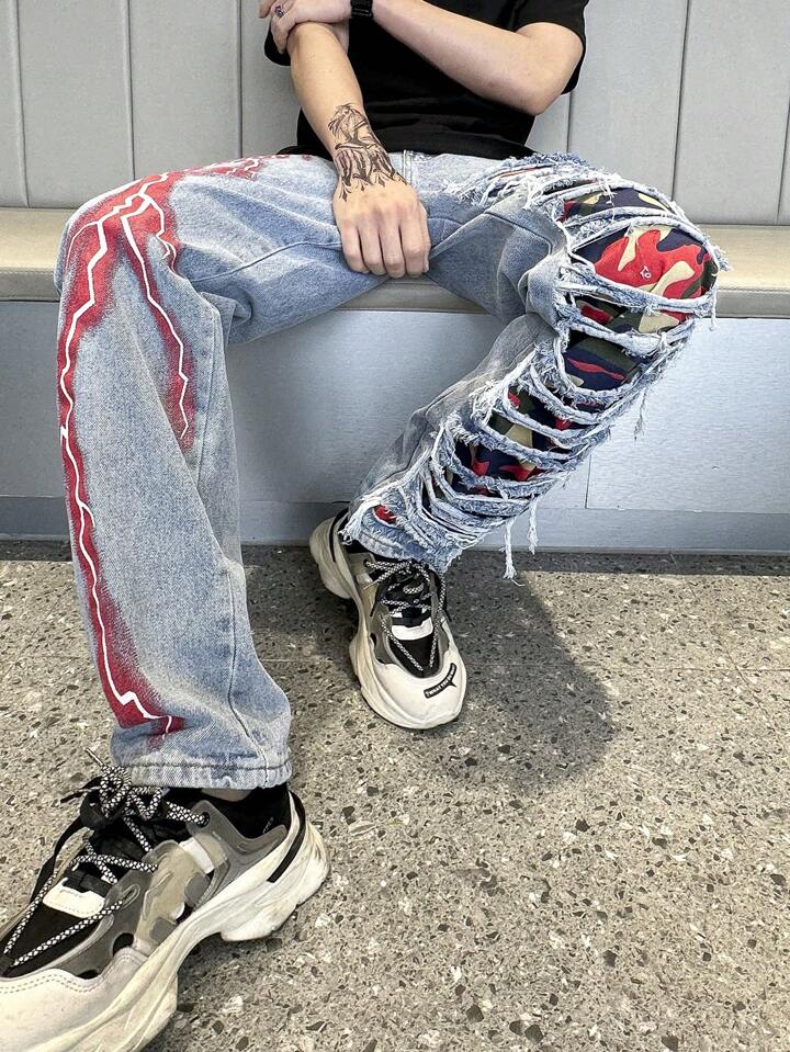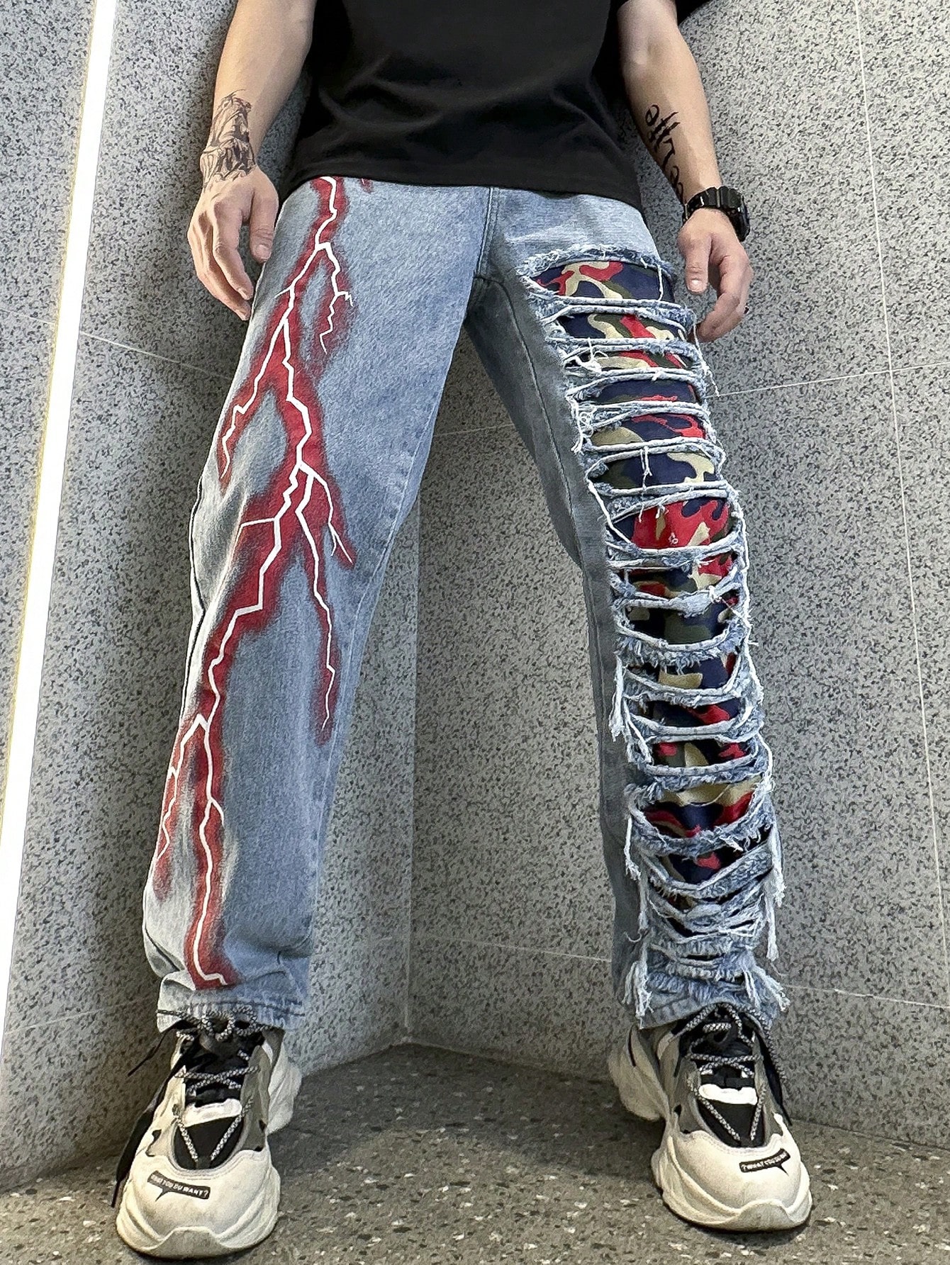Guys Lightning & Camo Print Ripped Frayed Straight Leg Jeans