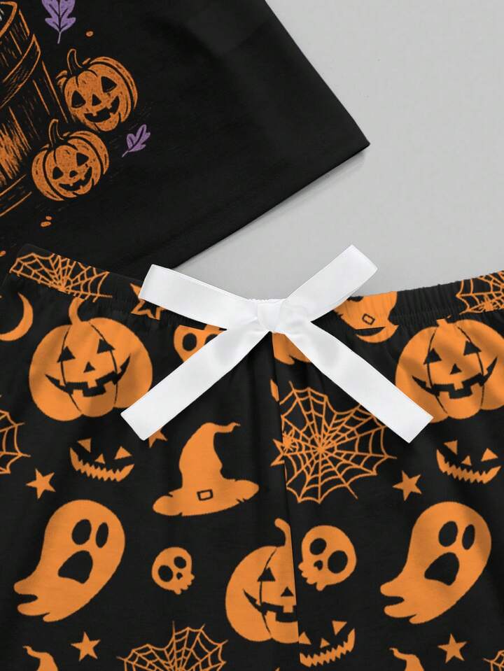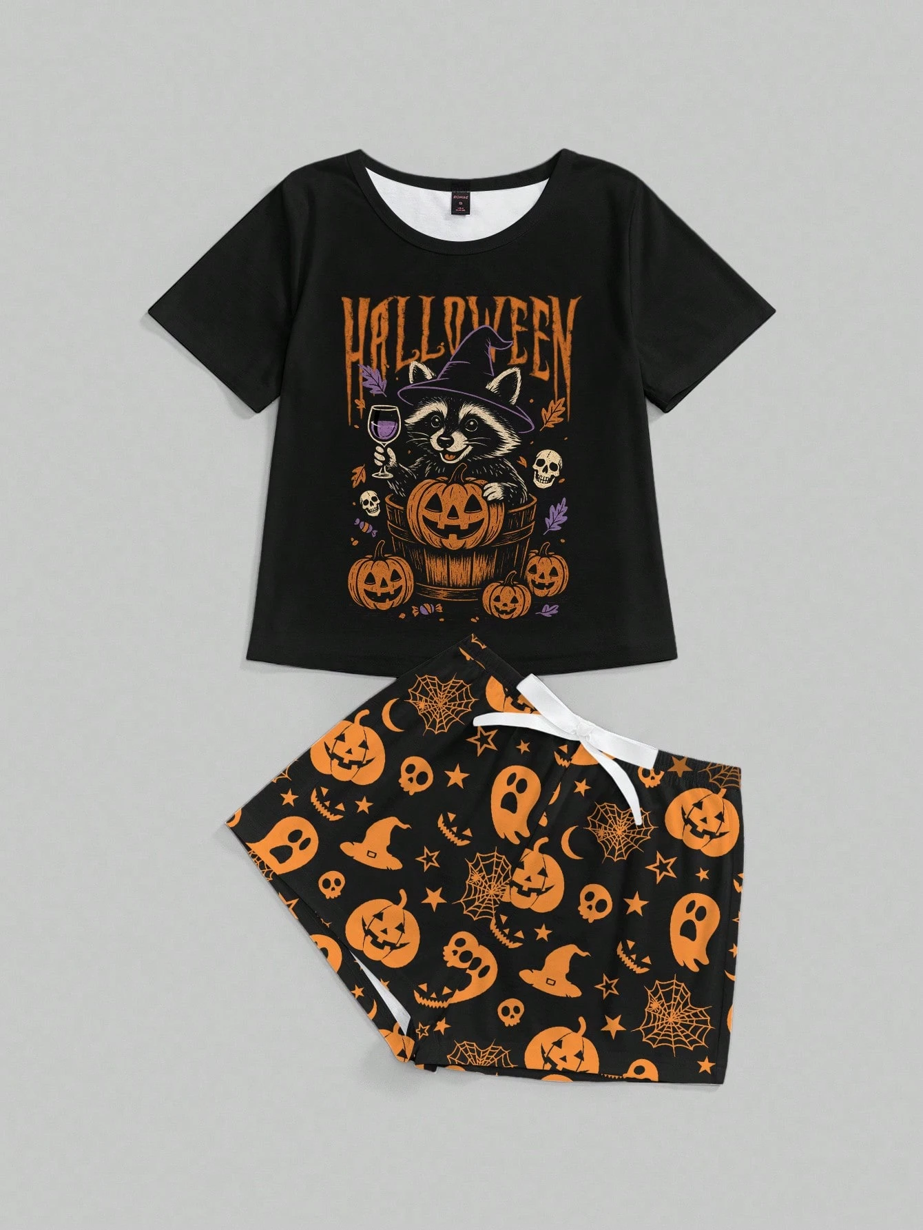 Halloween Raccoon, Pumpkin, Skull Print Short Sleeve & Shorts Pajama Set, Casual Loungewear
