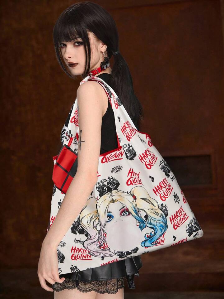 Harley Quinn | ROMWE 2pcs Dark Style Joker Girl Foldable Tote Bag, Large Capacity Reusable Shopping Bag For Outdoor, Supermarket