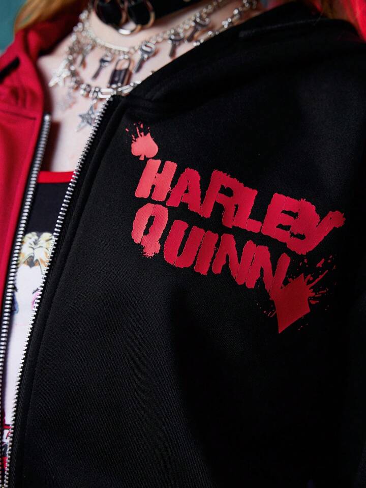 Harley Quinn | ROMWE Letter Graphic Colorblock Zip Up Drawstring Hoodie