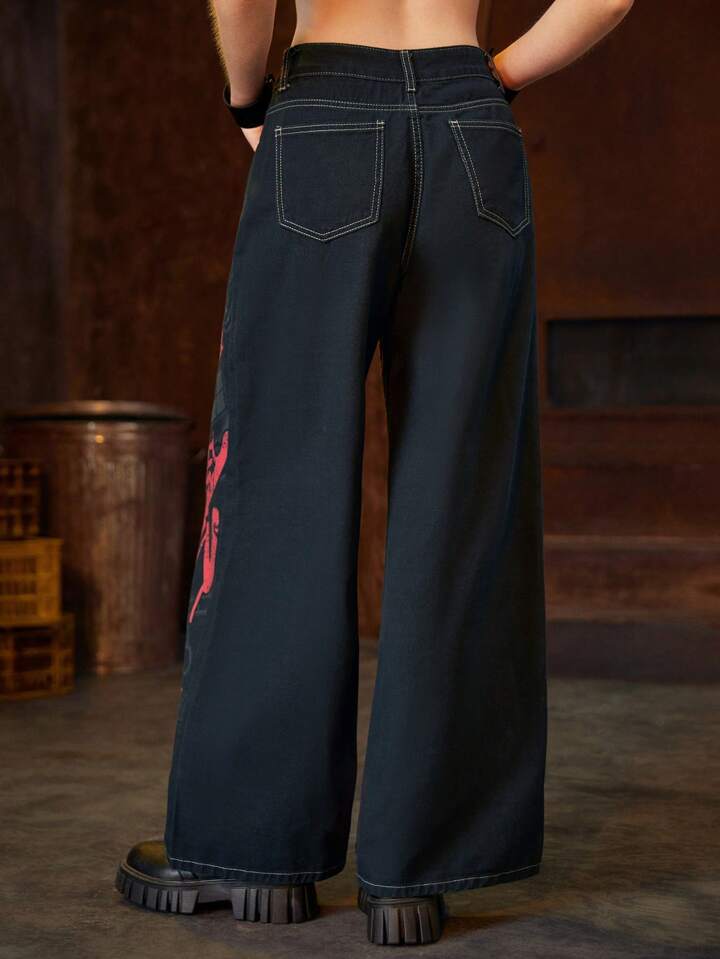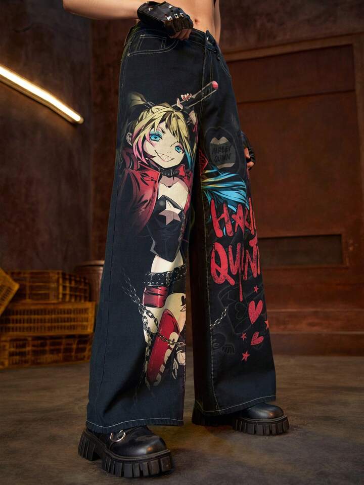 Harley Quinn | ROMWE Women's Casual Cartoon Character & Letter Print Wide Leg Jeans