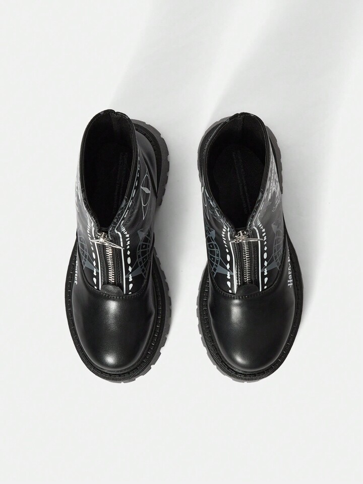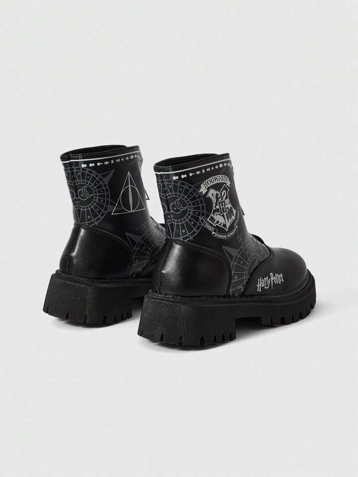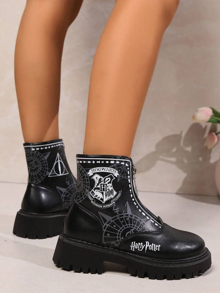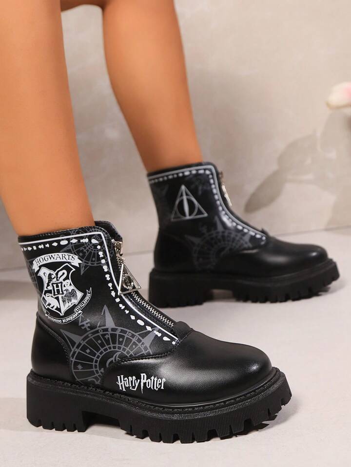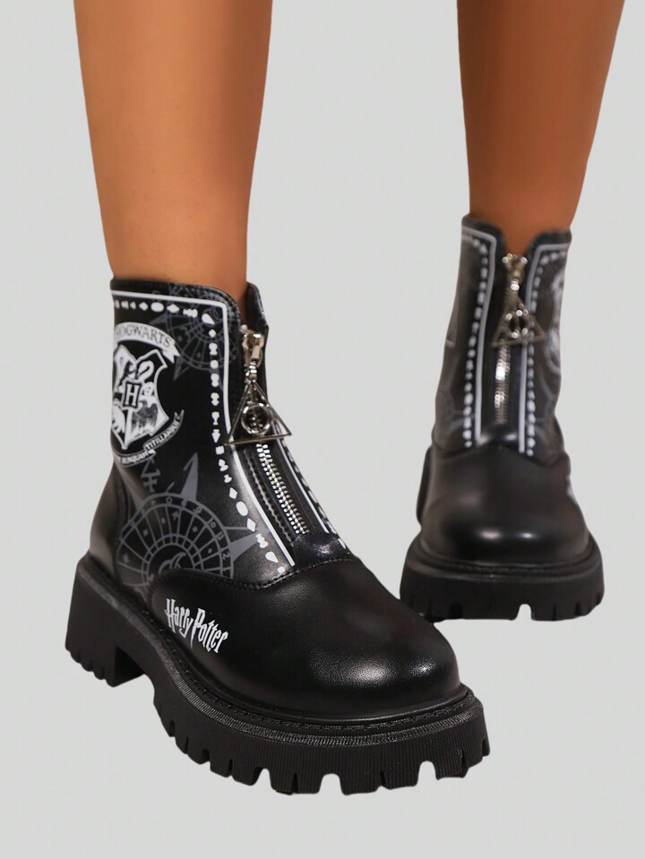Harry Potter | ROMWE Women's Emblem Print Zip-Up Flat Boots, Retro Short Boots