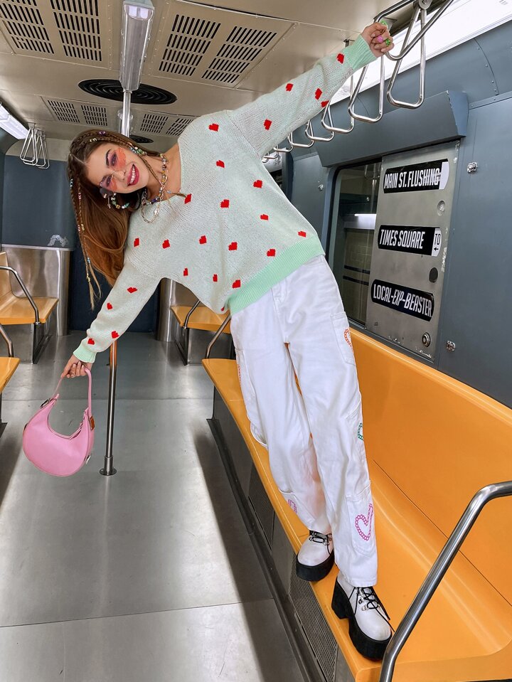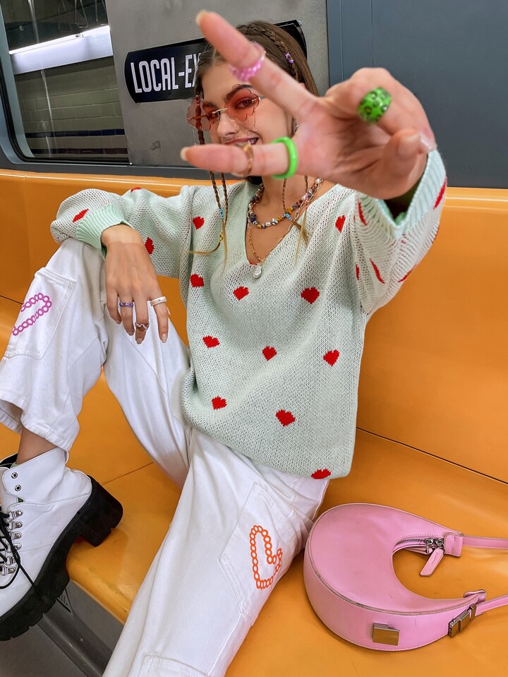 Heart Pattern Drop Shoulder Sweater