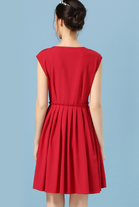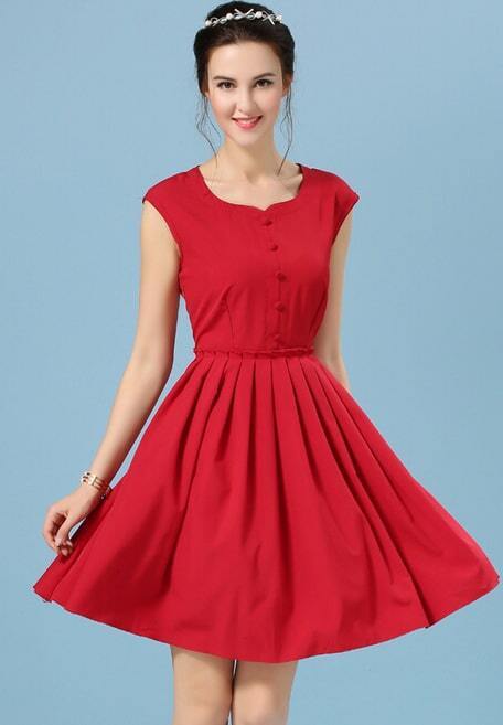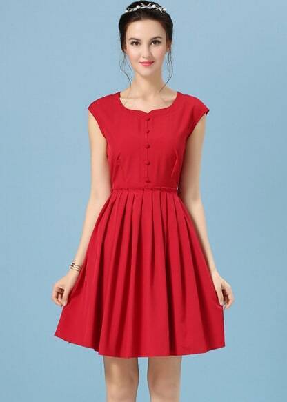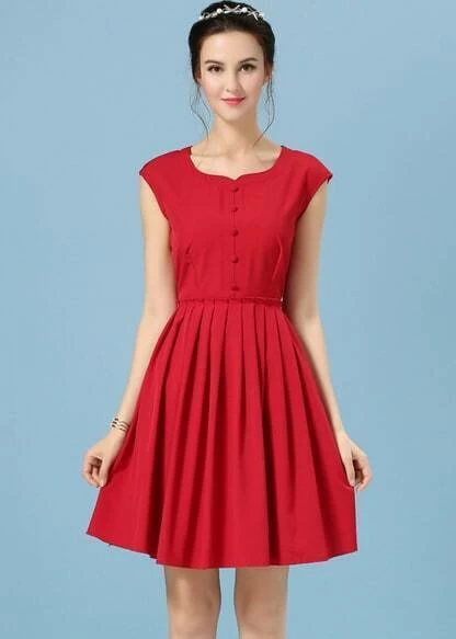 Heart-shaped Collar With Buttons Pleated Maroon Dress