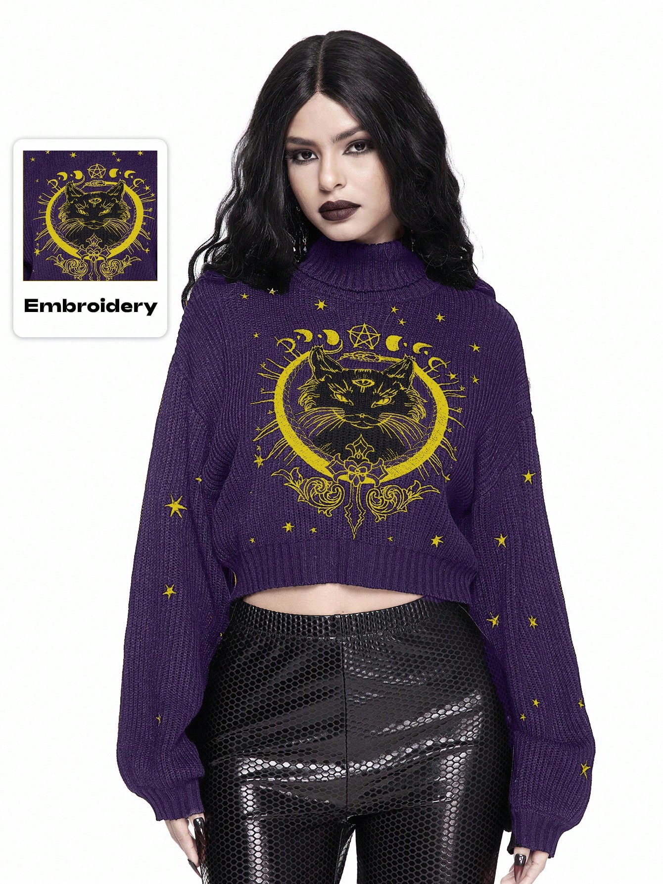 Goth High Neck Dark Gothic Black Mysterious Cat Embroidery Pullover Sweater
