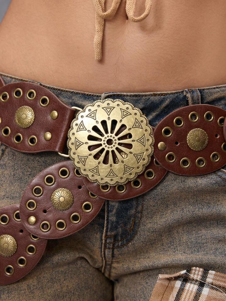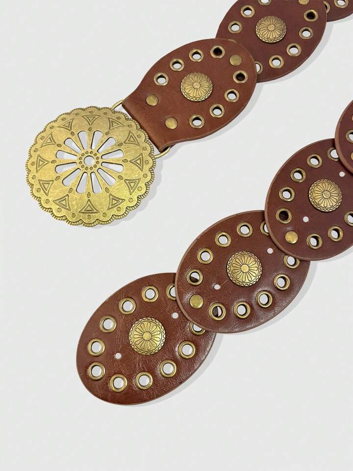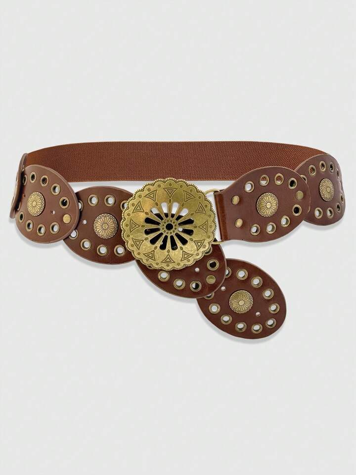 Hippie 1pc Women's Brown Oval Leather Metal Grommet Hollow Flower Button Decor Elastic Waist Belt, Boho Western Style, Suitable For Dresses, Jeans And Casual Daily Wear