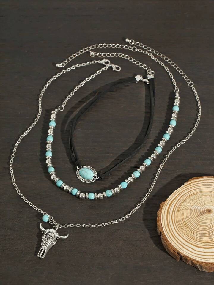 Hippie 3pcs Western Cowboy Style Turquoise Beaded Necklaces With Bull Head Pendant