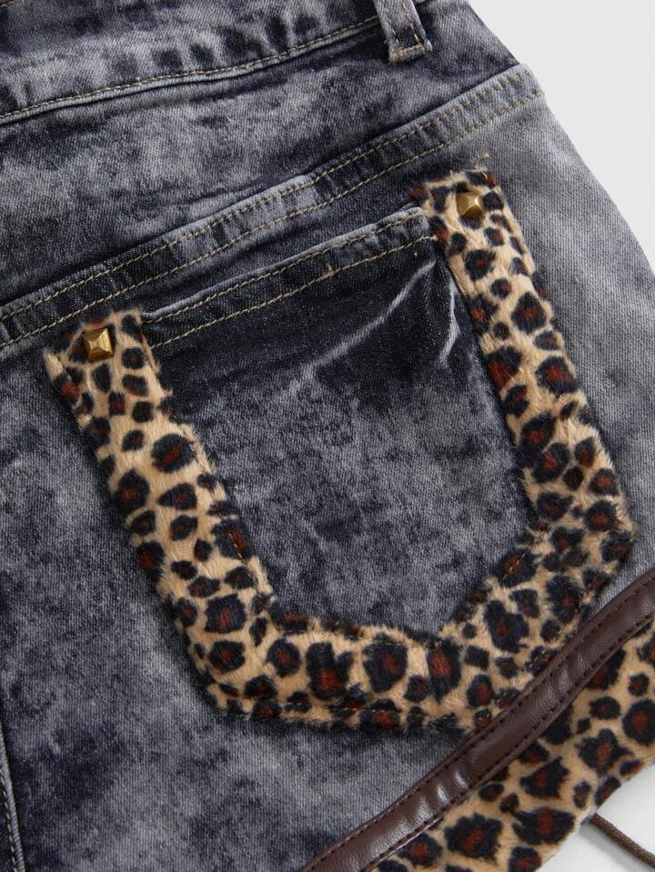 Hippie Boho Y2K Patchwork Leopard Print PU Lace-Up Low Waist Denim Shorts