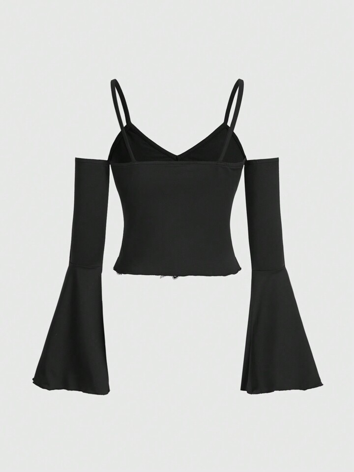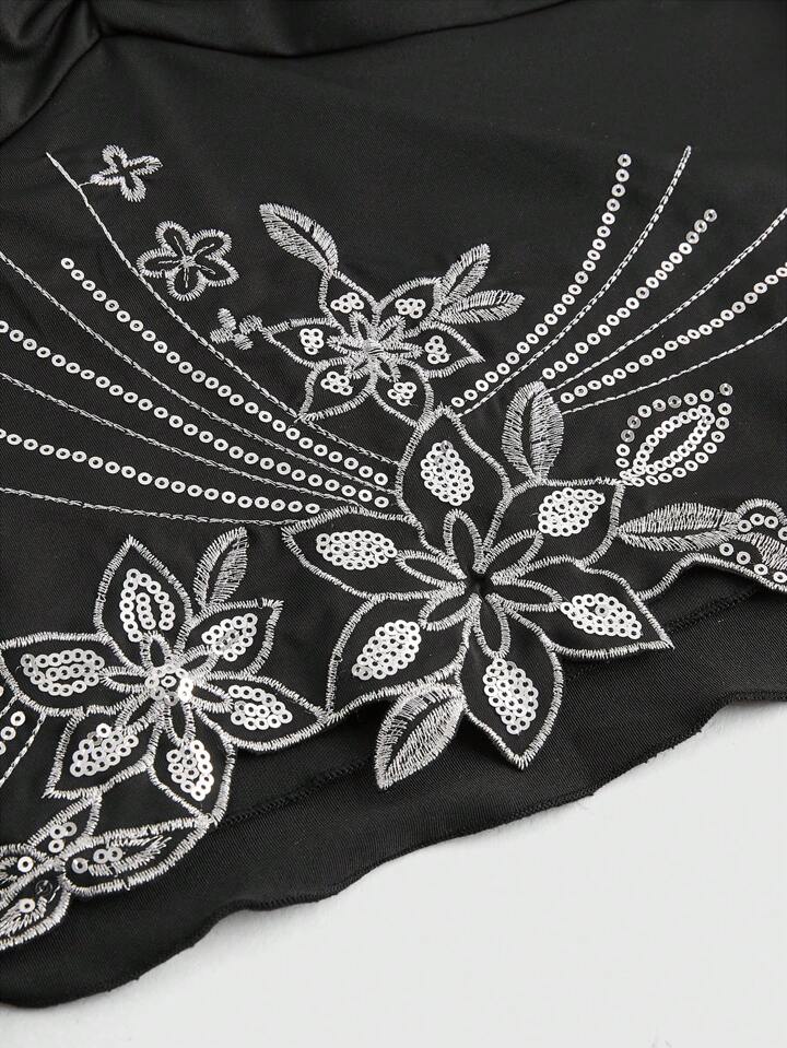 Hippie Gothic Floral & Beaded Embroidery Asymmetrical Hem Design Open Shoulder Bell Sleeve Women's T-Shirt