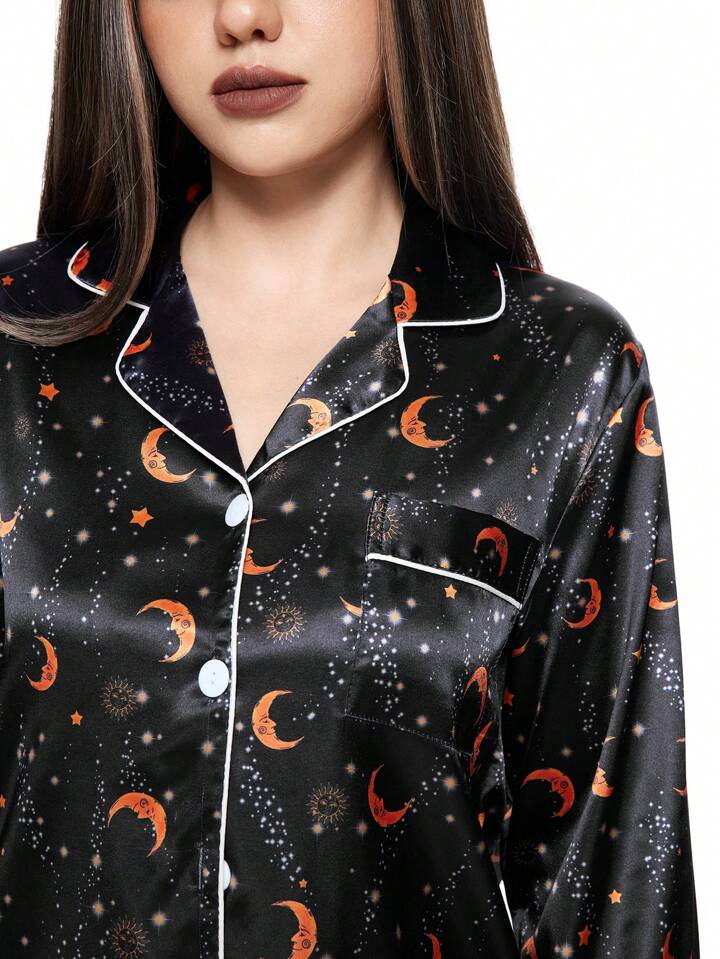 Hippie Moon & Star Satin Full Print Lapel Collar Long Sleeve Lounge Pajama Set