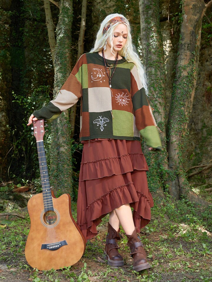 Hippie Patchwork Sun & Moon Pattern Drop Shoulder Sweater