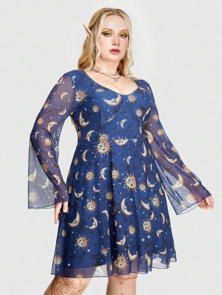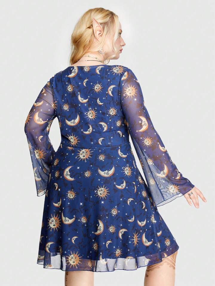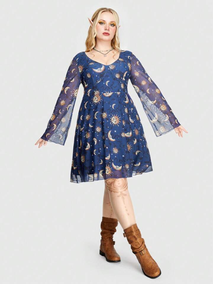 Hippie Plus Size Summer Casual Sun Moon Stars Printed Mesh Dress